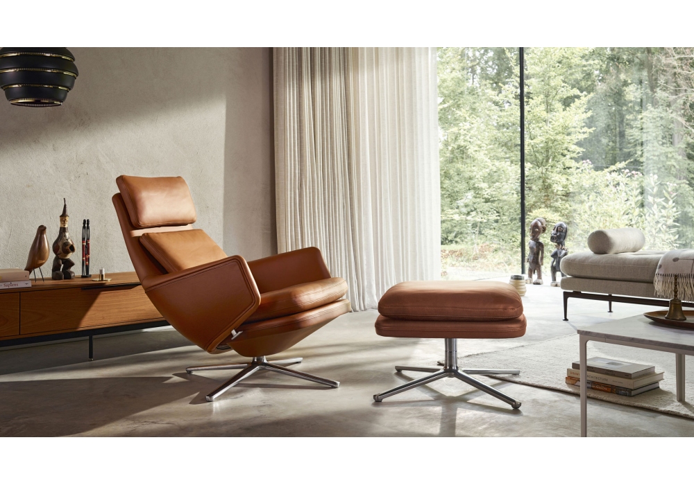 Grand Relax Ottoman firmato da Antonio Citterio per Vitra è un poggiapiedi con base girevole a quattro razze in alluminio pressofuso, finitura lucida o verniciata a polvere. Il contorno del sedile e il cuscino sono rivestiti in Pelle.
