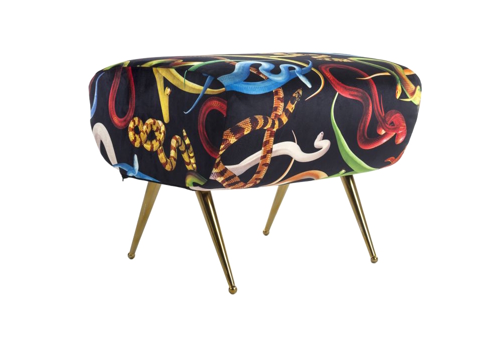 Pouf Serpenti firmato da Toiletpaper Magazine per Seletti è un pouf con base a quattro piedi in metallo tubolare con particolari color ottone. La scocca è in legno multistrato imbottita in poliuretano rivestita in tessuto di poliestere.