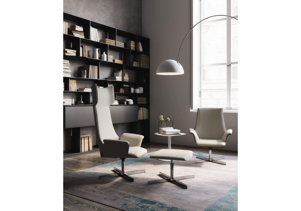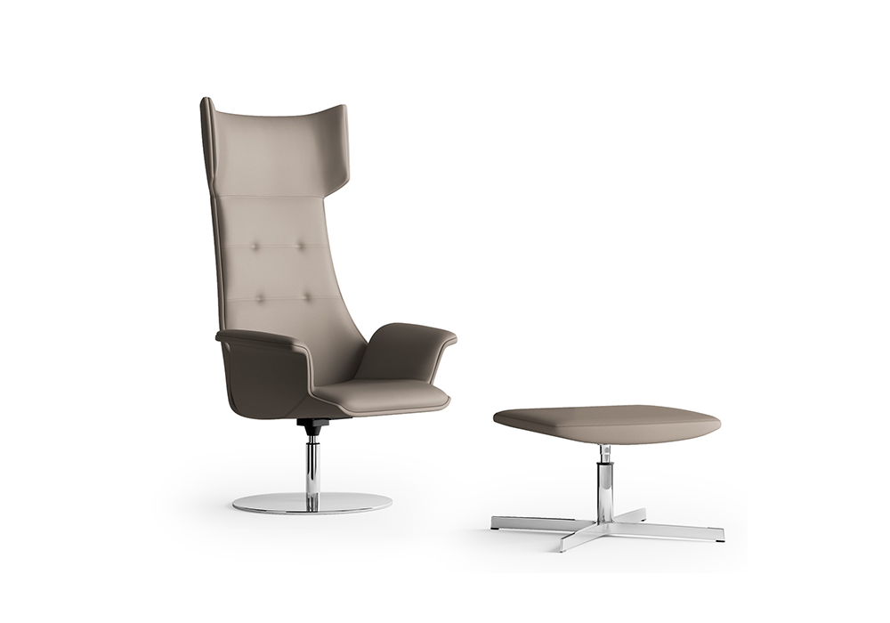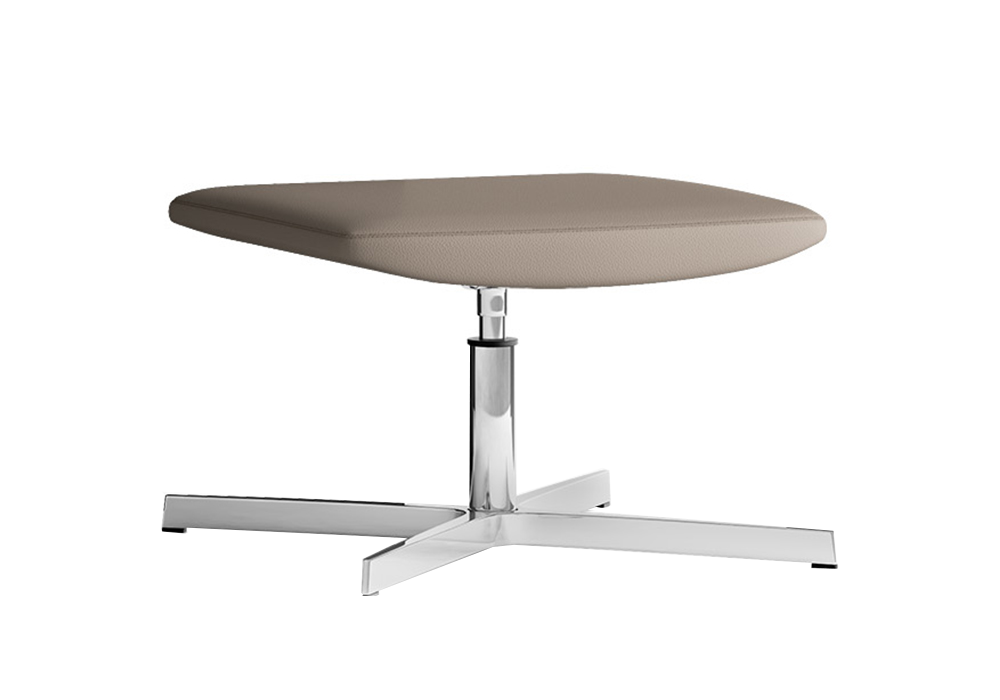 Maxima firmato R&D Sitlosophy per Sitlosophy è un poggiapiedi girevole con base a 4 razze in alluminio e rivestimento in una svariata selezione di pelli, ecopelli o tessuti.