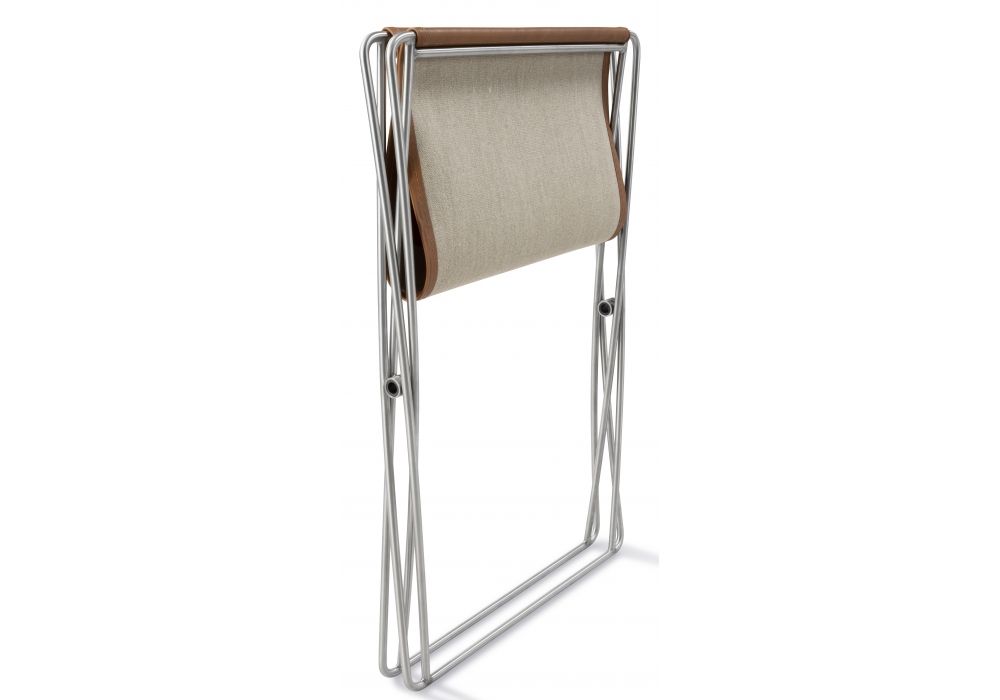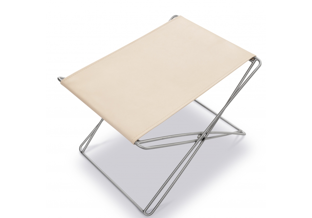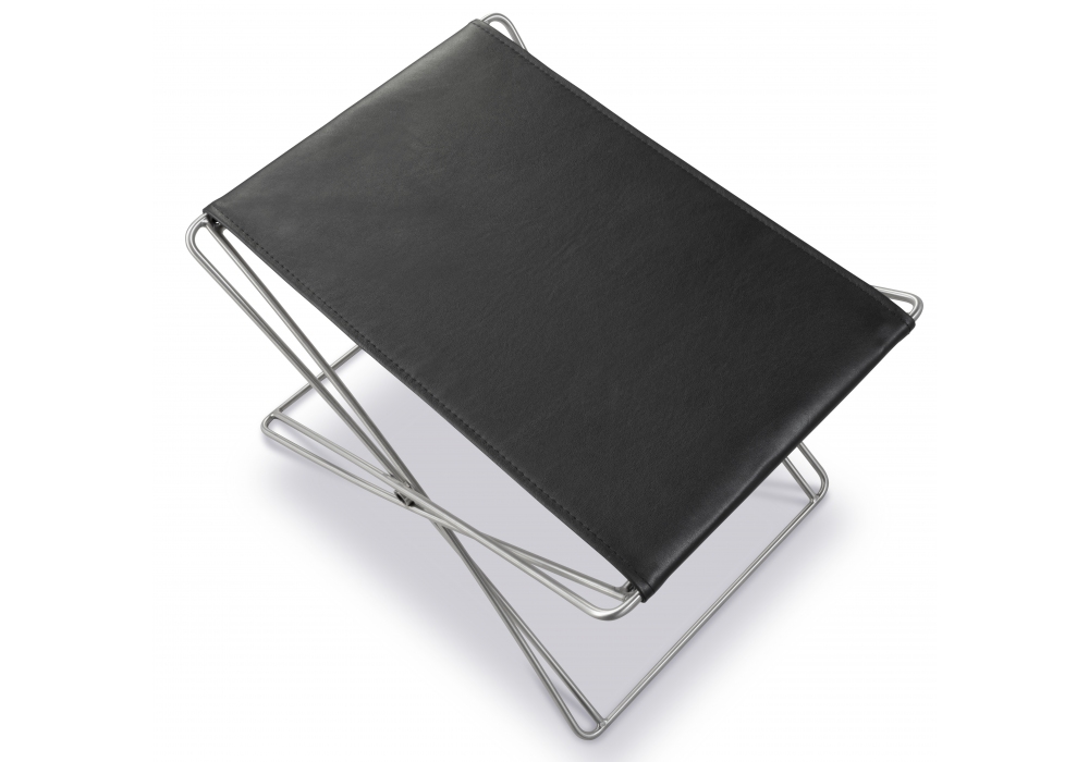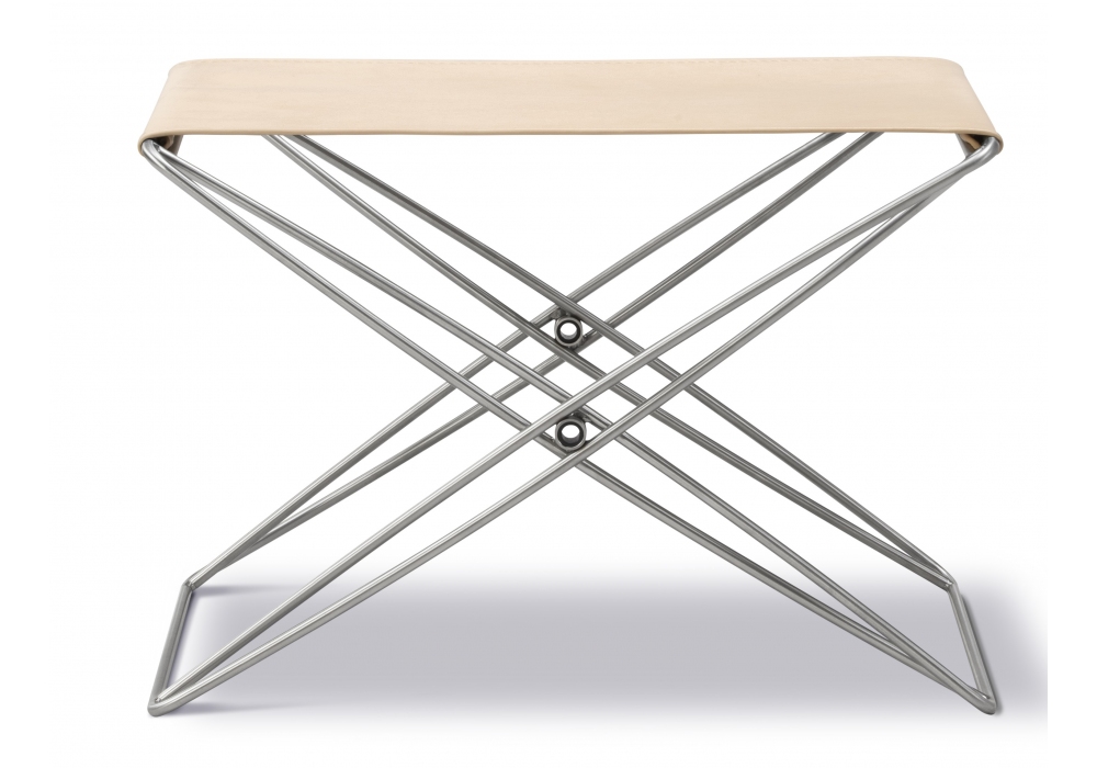 JG firmato da Jørgen Gammelgaard per Fredericia è un poggiapiedi pieghevole con struttura in acciaio inox e seduta in pelle o tela. Il sedile in pelle ha tela supporto.