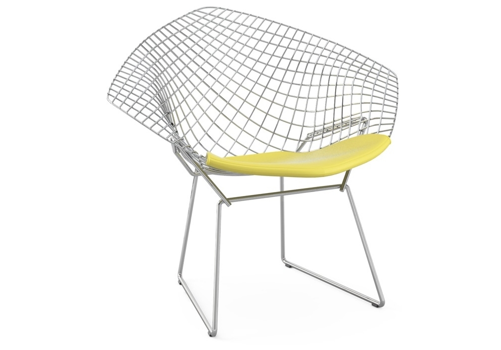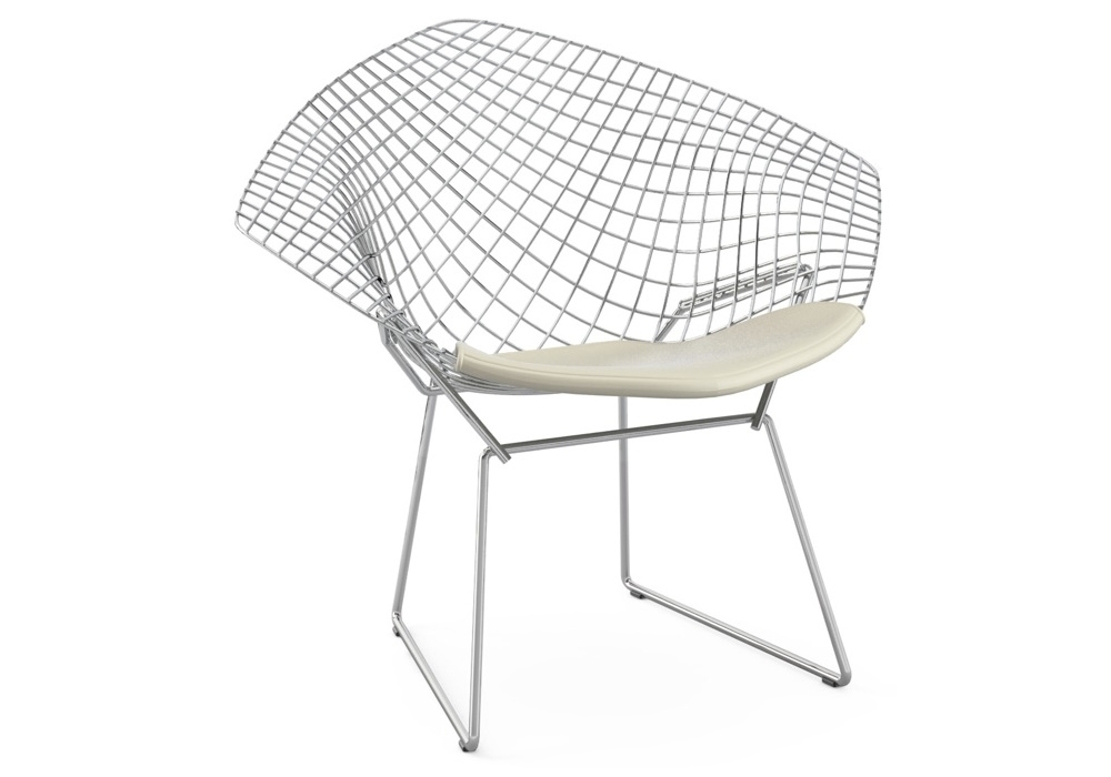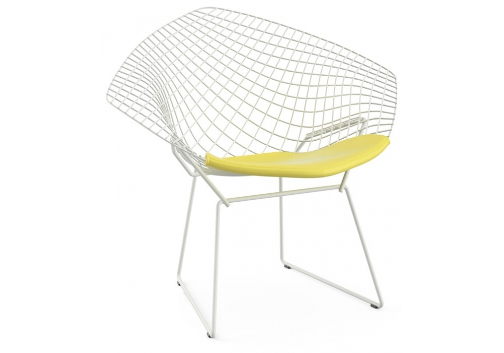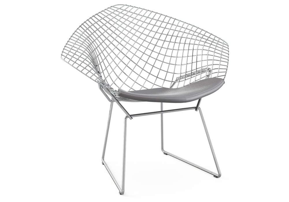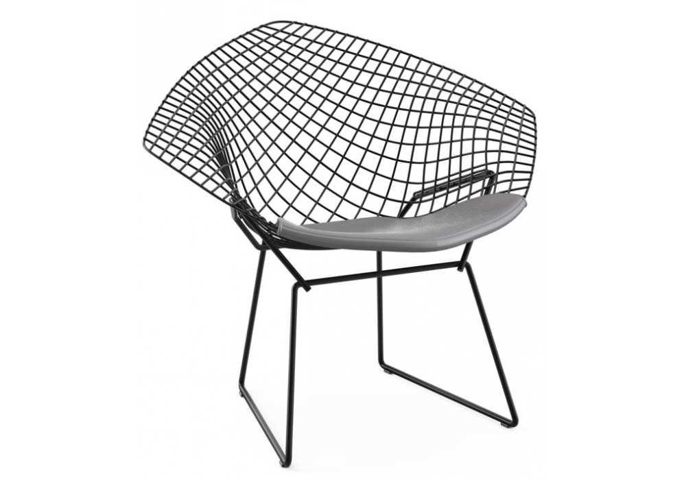 Bertoia Diamond firmata da Harry Bertoia è una poltroncina con struttura realizzata in tondino d'acciaio salato ad ogni intersezione in differenti finiture. La struttura è dotata di 4 pattini in plastica nera. Cuscino rivestito in differenti tessuti o pelli.