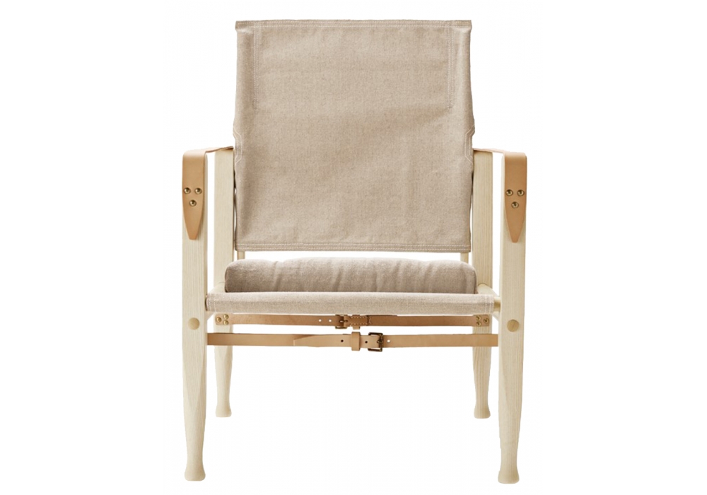 KK47000 Safari firmata da Kaare Klint per Carl Hansen & Søn è una poltroncina con struttura in legno massello di frassino. Sedile, schienale e cuscino in canvas naturale (100% lino) o in pelle, braccioli in cuoio.