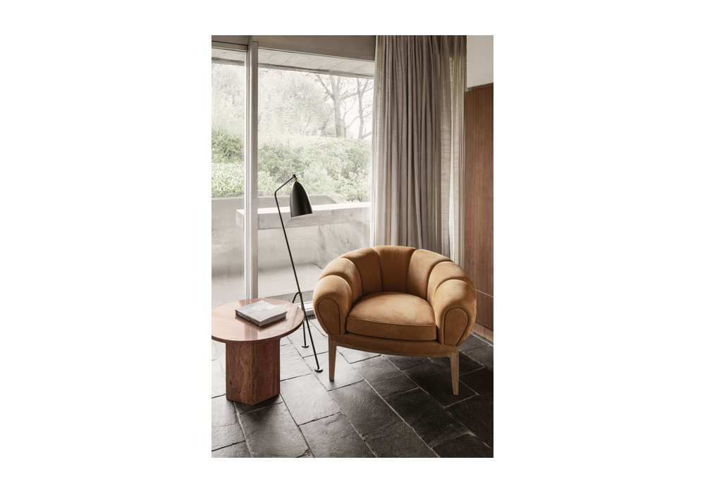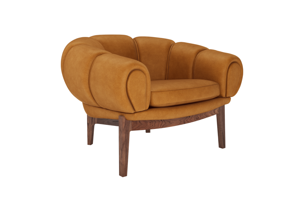 Croissant firmata da Illum Wikkelsø per Gubi è una poltrona lounge completamente imbottita con base in noce americano o rovere.