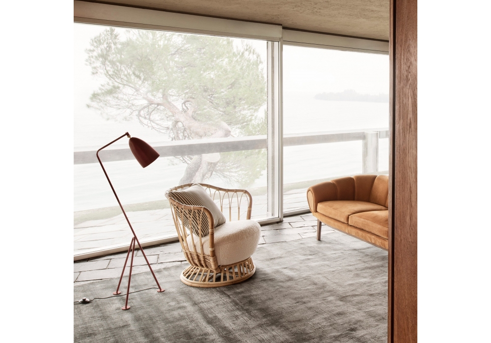 Grace firmata da Tove Kindt Larsen per Gubi è una poltrona composta da una seduta circolare su una base circolare leggermente più grande, sfalsata, con uno schienale avvolgente popolato da lunghi anelli di rattan. La parte inferiore dello schienale è intrecciata per sostenere un generoso cuscino di seduta imbottito.