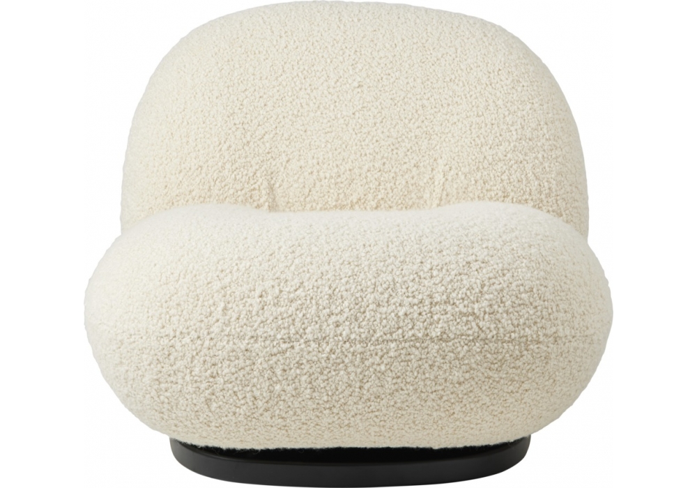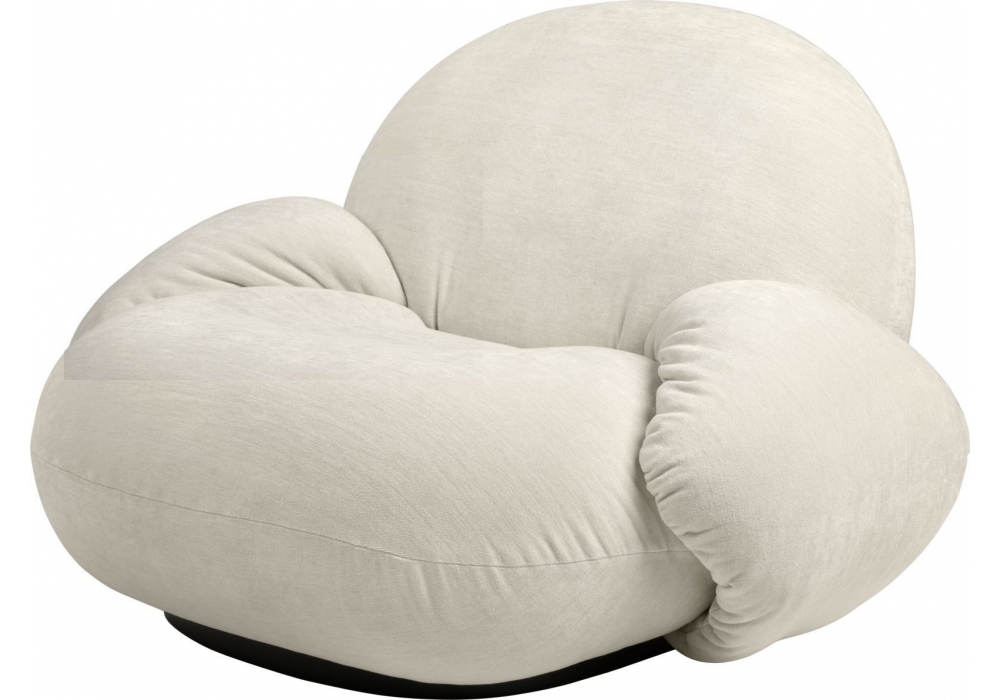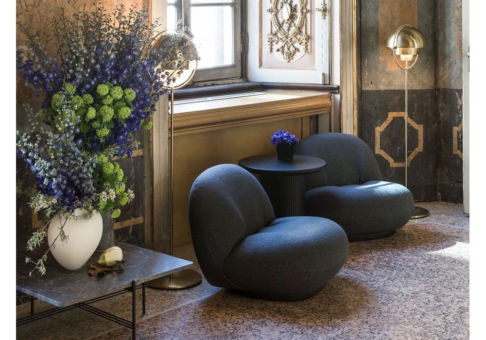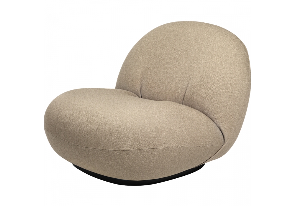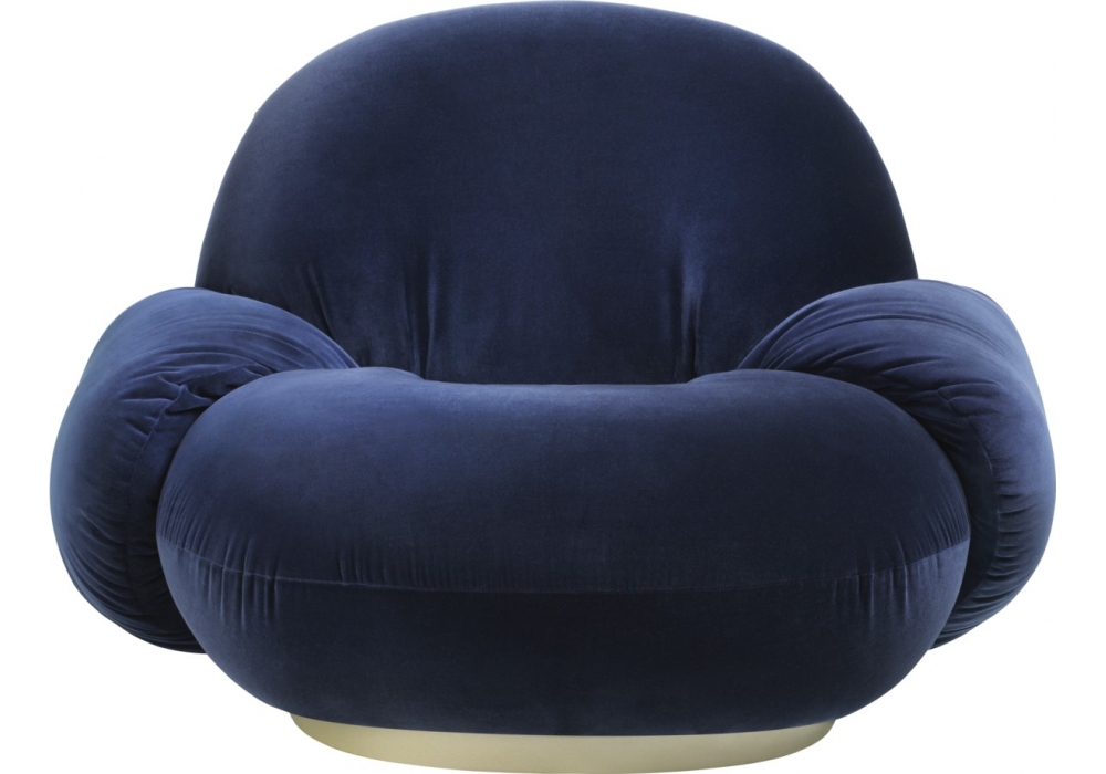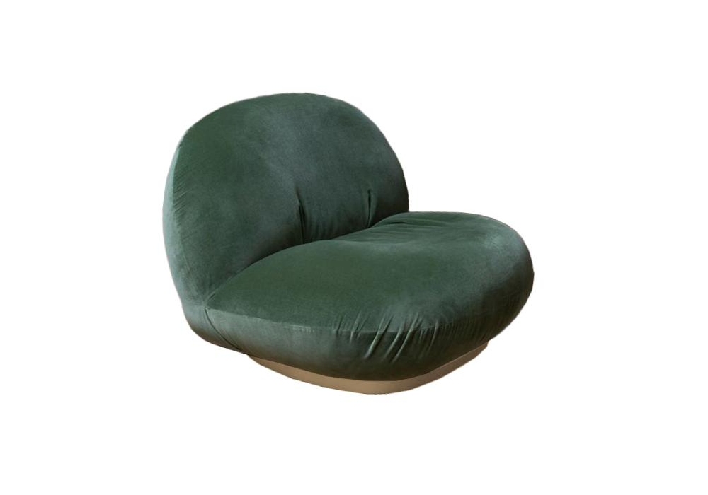 Pacha designed by Pierre Paulin for Gubi is a lounge chair completely padded and upholstered in fabric or leather with wooden base. It is available with and without armrests and also in a swivel version.