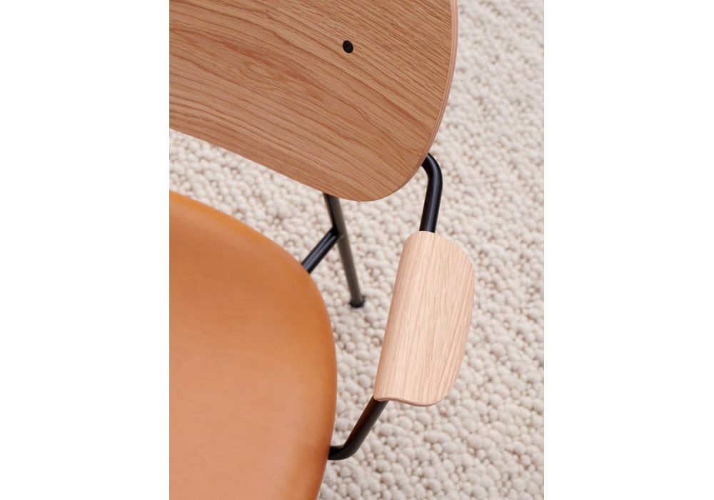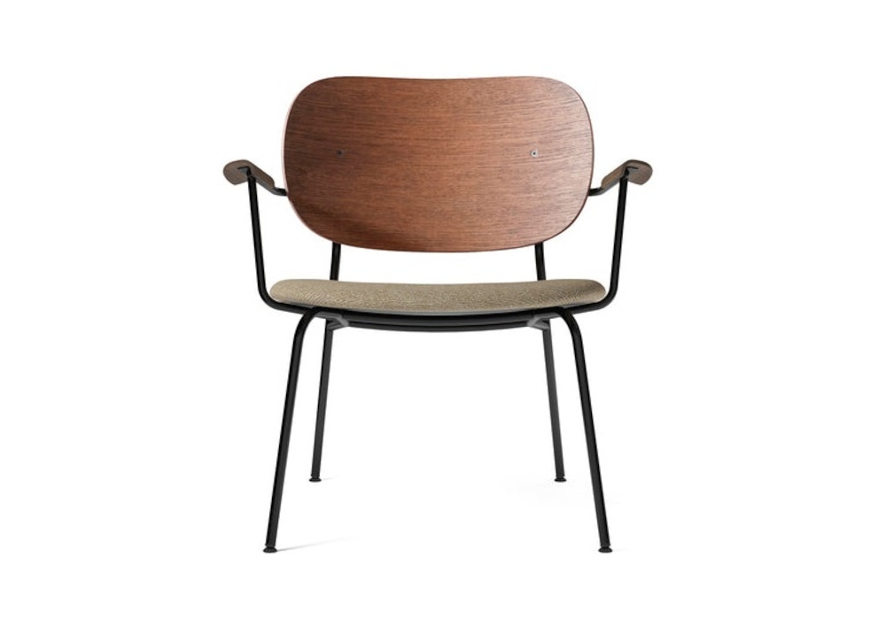 Co Seat firmata da Norm Architects & Els Van Hoorebeeck per Audo Copenhagen è una poltroncina con seduta imbottita rivestita in tessuto o pelle, schienale in rovere e gambe in acciaio verniciato a polvere nero. Disponibile in diverse finiture.