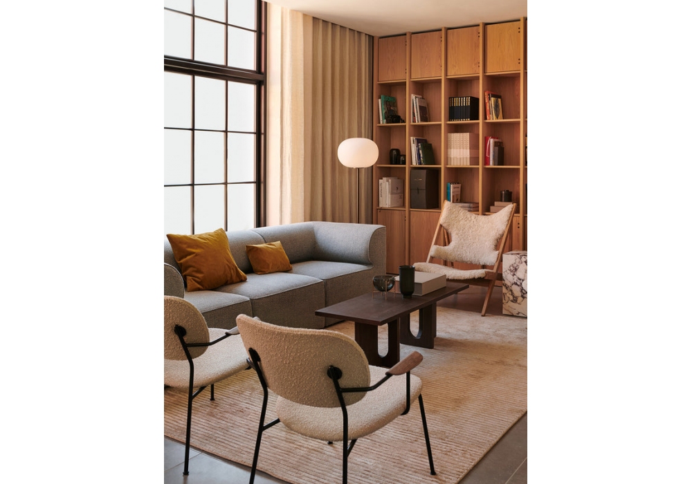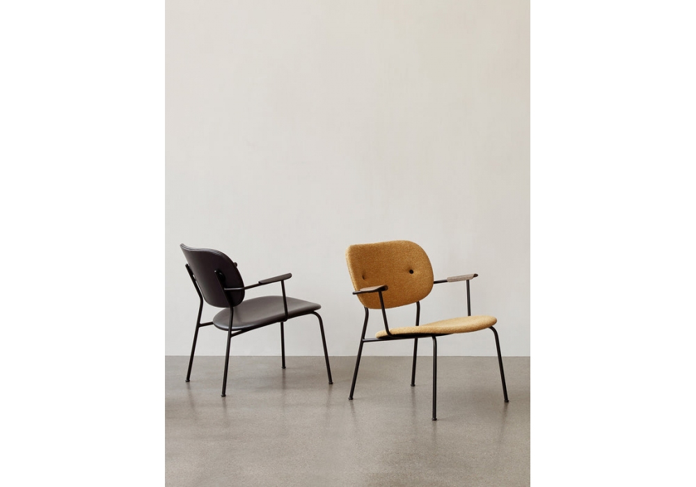 Co Fully firmata da Norm Architects & Els Van Hoorebeeck per Audo Copenhagen è una poltroncina con seduta e schienale imbottiti e rivestiti in tessuto o pelle, braccioli in rovere e gambe in acciaio verniciato a polvere nero. Disponibile in diverse finiture.