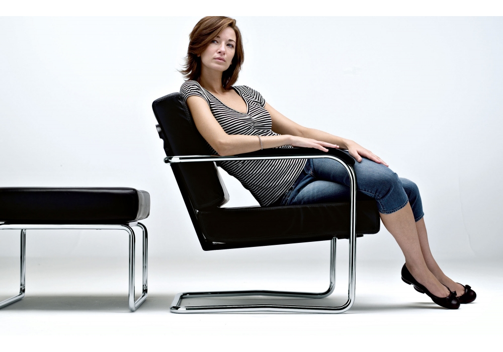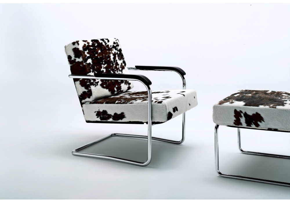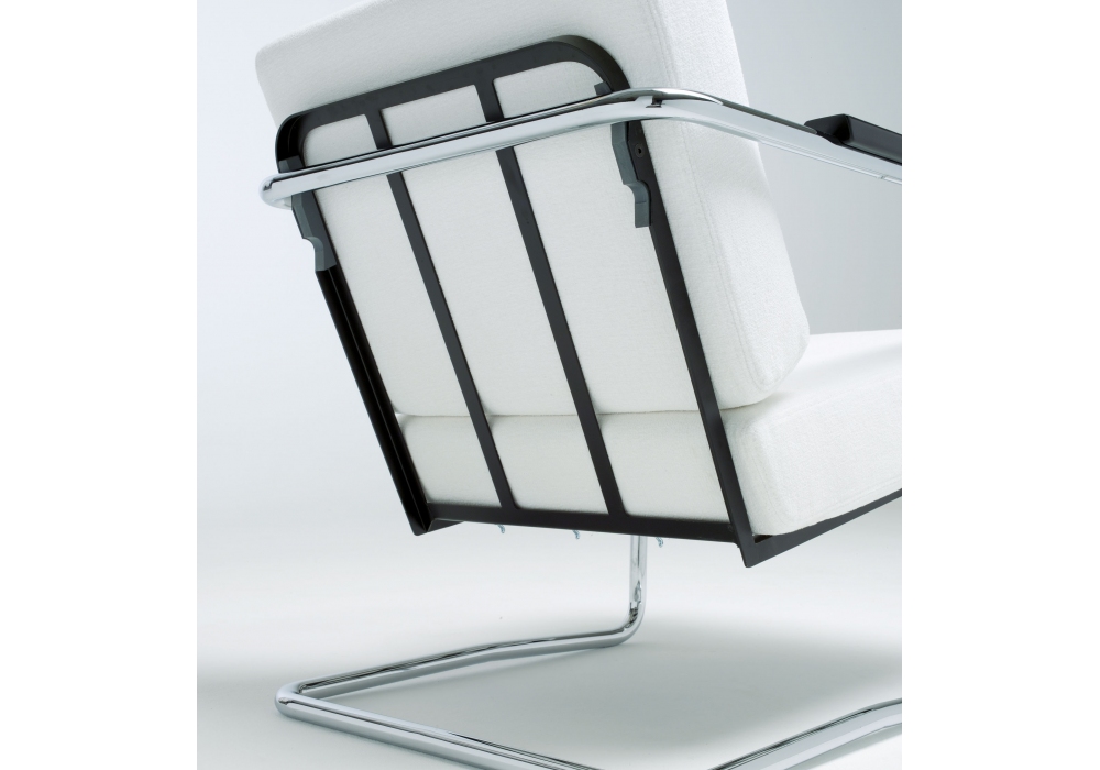 WM firmata da Werner Max Moser per MisuraEmme è una poltroncina con struttura in tubolare cromato e braccioli in massello di legno laccato nero. Cuscini seduta e schienale in espanso con rinforzo in multistrati e rivestimento sfoderabile in tessuto o pelle. Disponibile con o senza pouf.