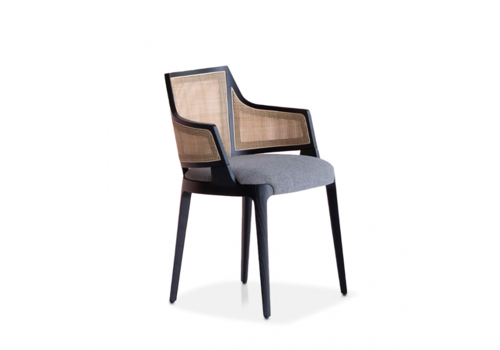 Velis Cane firmata da Mario Ferrarini per Potocco è una poltroncina con struttura in legno di frassino o noce canaletto in differenti finiture. La seduta è imbottita con schiuma poliuretanica e rivestita in svariati tipi di tessuto, pelle o ecopelle mentre lo schienale è in paglia di vienna naturale.
