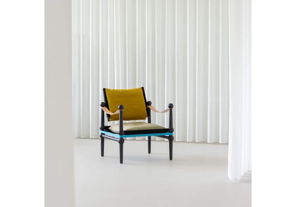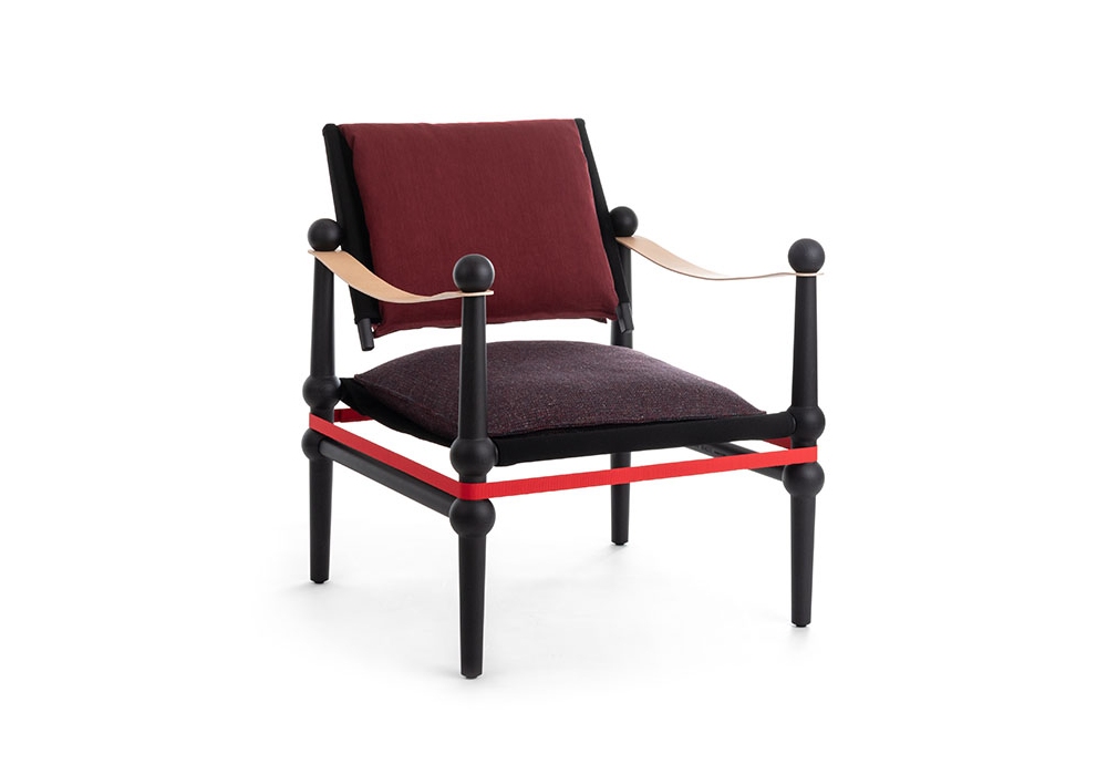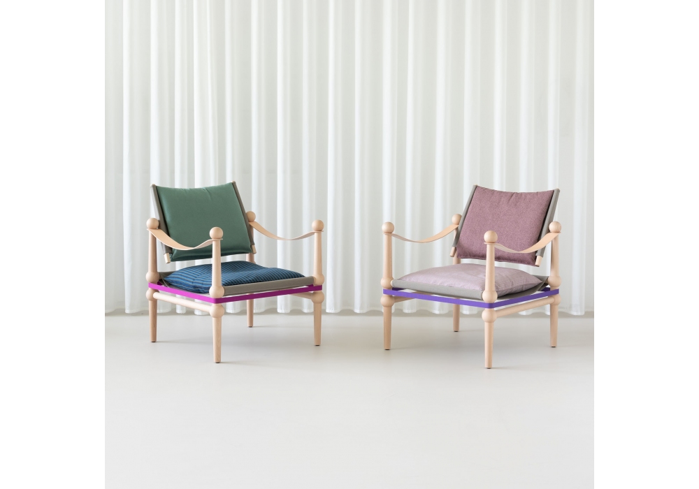 Twain firmata da Konstantin Grcic per Magis è una poltroncina bassa con struttura in massello di faggio tinto naturale o allìanillina nero. Braccioli in cuoio pieno fiore. Rivestimento in tessuto.