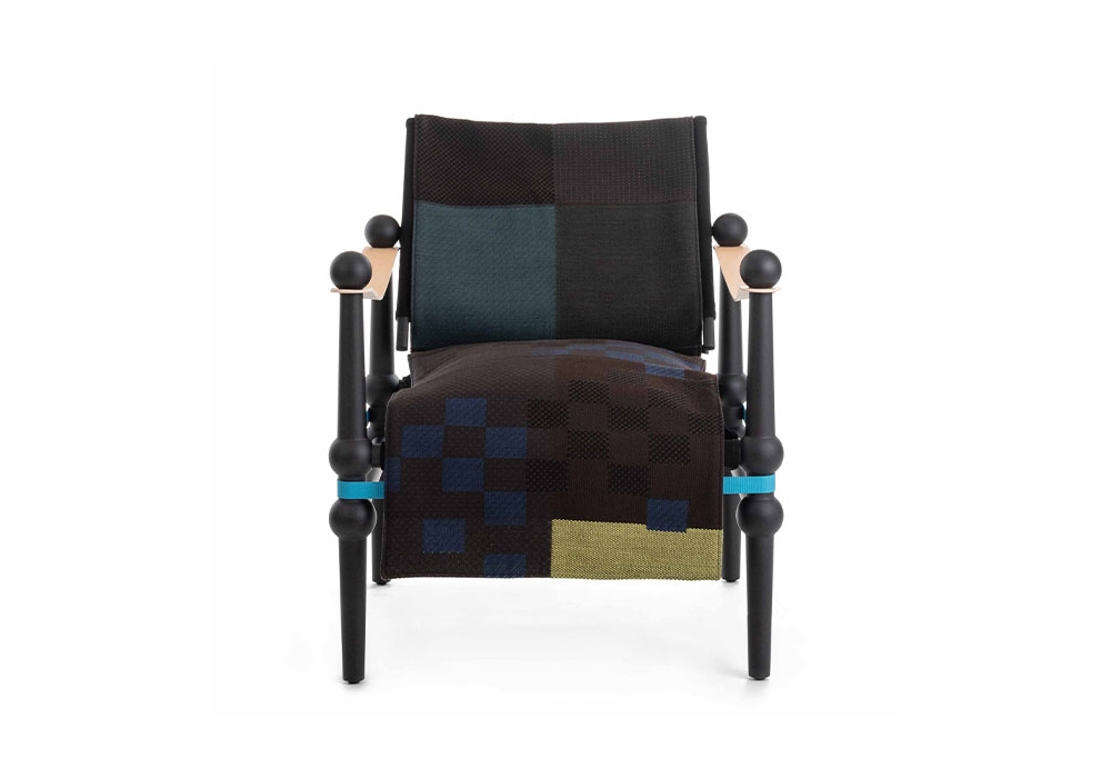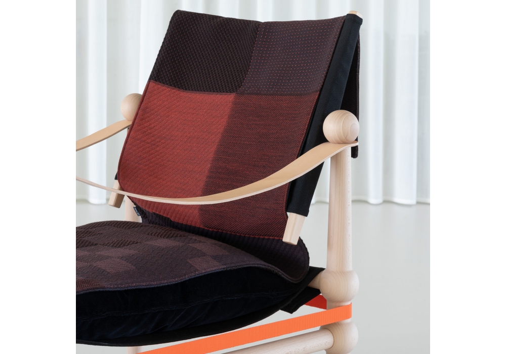 Twain Lounge firmata da Konstantin Grcic in partnership with Hella Jongerius per Magis è una poltroncina bassa con struttura in massello di faggio, sedile e schienale in tessuto, coperta a drappo, braccioli in cuoio pieno fiore. Disponibile in diverse finiture.