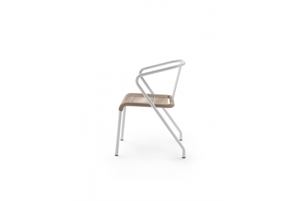 Calipso firmata da Antonio Citterio per Flexform è una poltroncina da esterno in tubolare d'acciaio inox e sedile in alluminio, entrambi verniciati a forno con polveri.