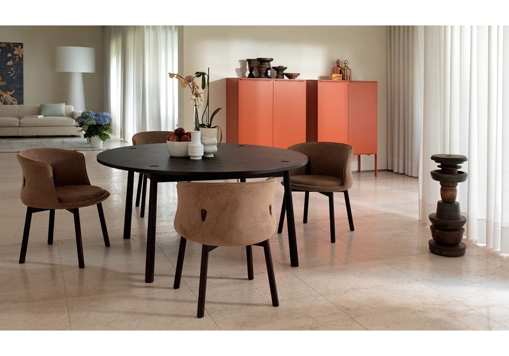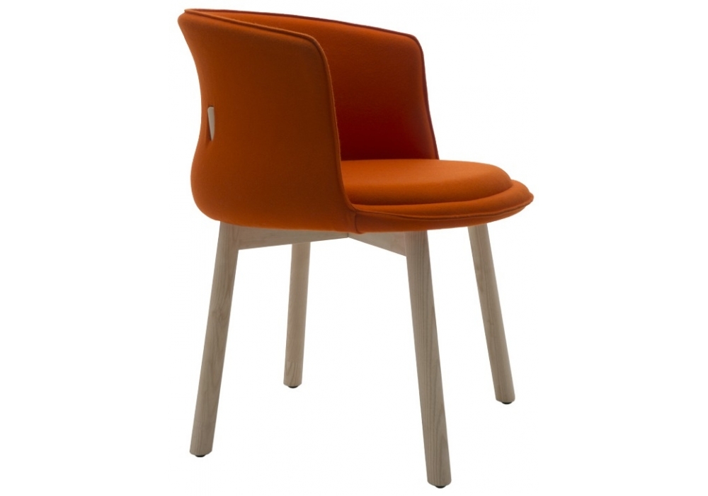 Peg Chair firmata da Nendo per Cappellini è una poltroncina imbottita con gambe in massello di frassino e rivestimento fisso in tessuto o in pelle. Disponibile in diverse finiture.