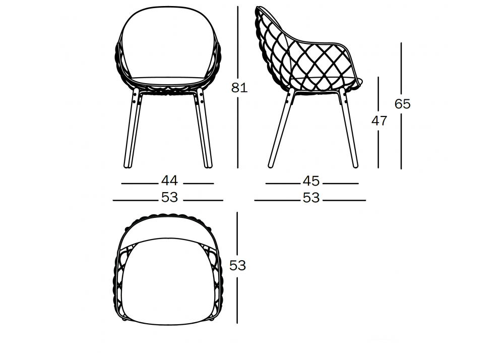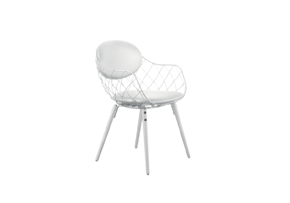 Piña firmata da Jaime Hayón per Magis è una poltroncina con gambe in massello di frassino verniciato e scocca in tondino d'acciaio verniciato in tinta al rivestimento. Cuscino sedile e schhienale in poliretano espanso con rivestimento in tessuto o pelle.