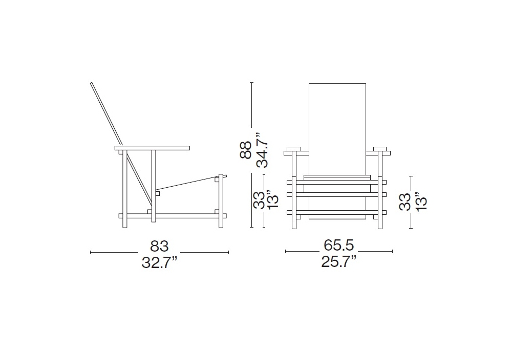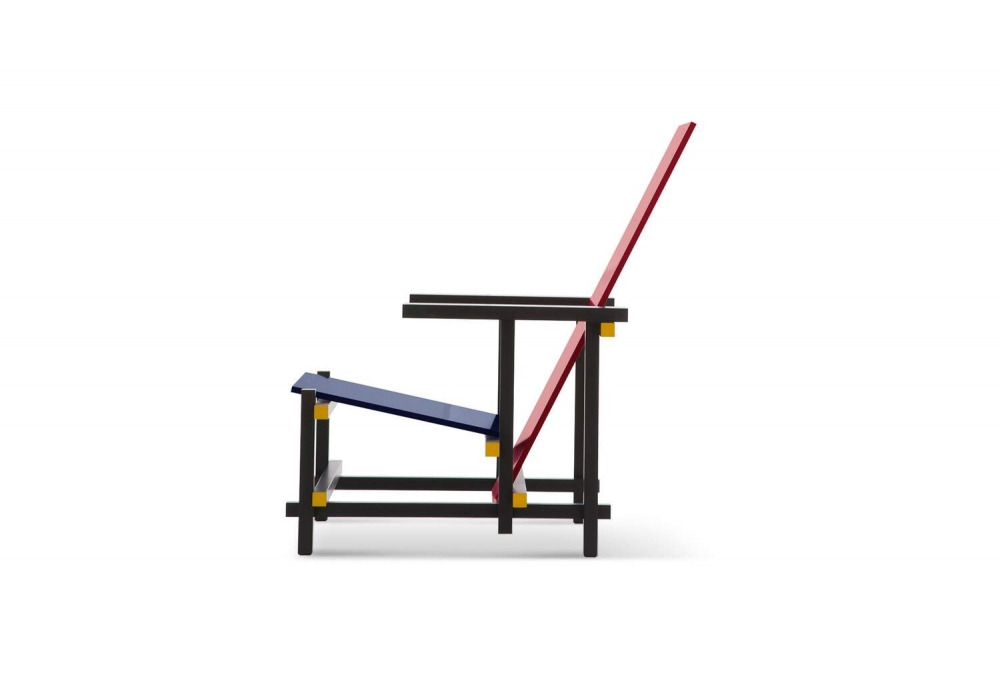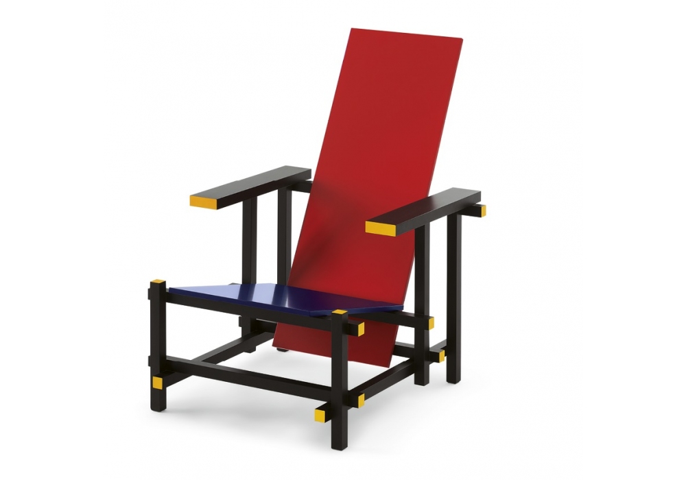 635 Red and Blue firmata da Gerrit T. Rietveld per Cassina è una poltroncina laccata realizzata con struttura tinto nero, sedile blu e schienale rosso.