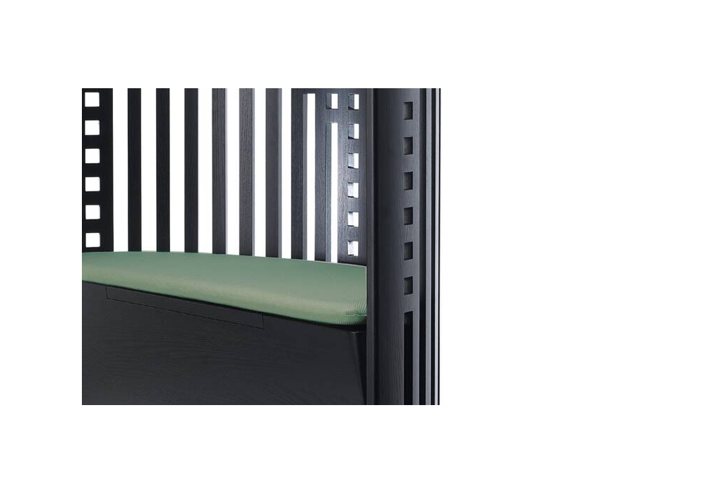312 Willow 1 firmata da Charles R. Mackintosh per Cassina è una poltroncinca realizzata con struttura in frassino tinto nero con cassetto interno sotto sedile e rivestimento seduta in velluto speciale.