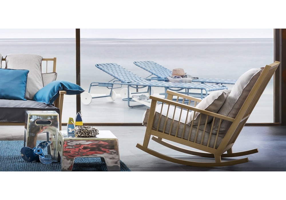 InOut 709 firmato da Paola Navone per Gervasoni è una poltrona a dondolo con struttura iroko oliato.