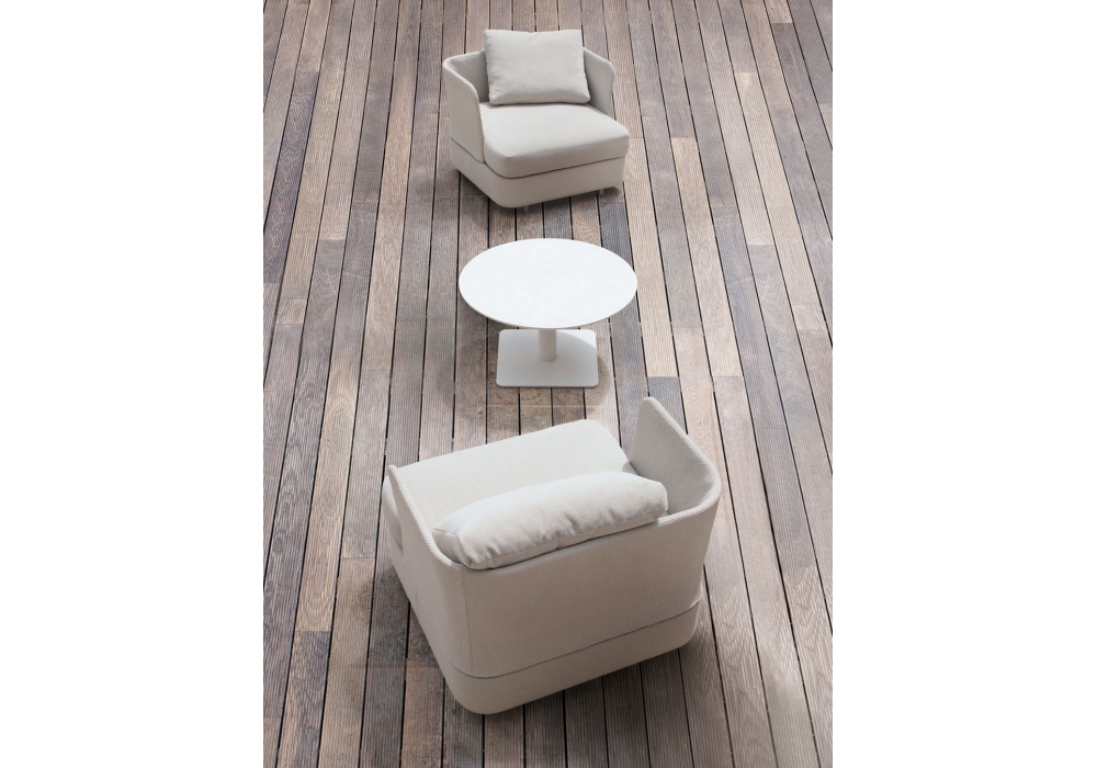 Cove firmata da Francesco Rota per Paola Lenti è una poltrona per esterni. Il rivestimento della struttura e delle sedute è disponibile in diversi tessuti e colori.