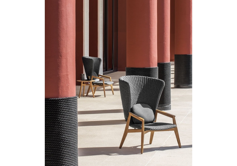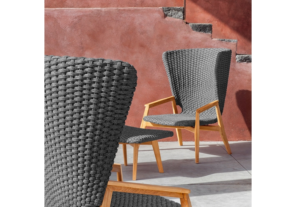 Knit firmata da Patrick Norguet per Ethimo è una poltrona con schienale alto strutturata in legno teak in differenti finiture e rivestimenti. Disponibile con o senza cuscinatura.
