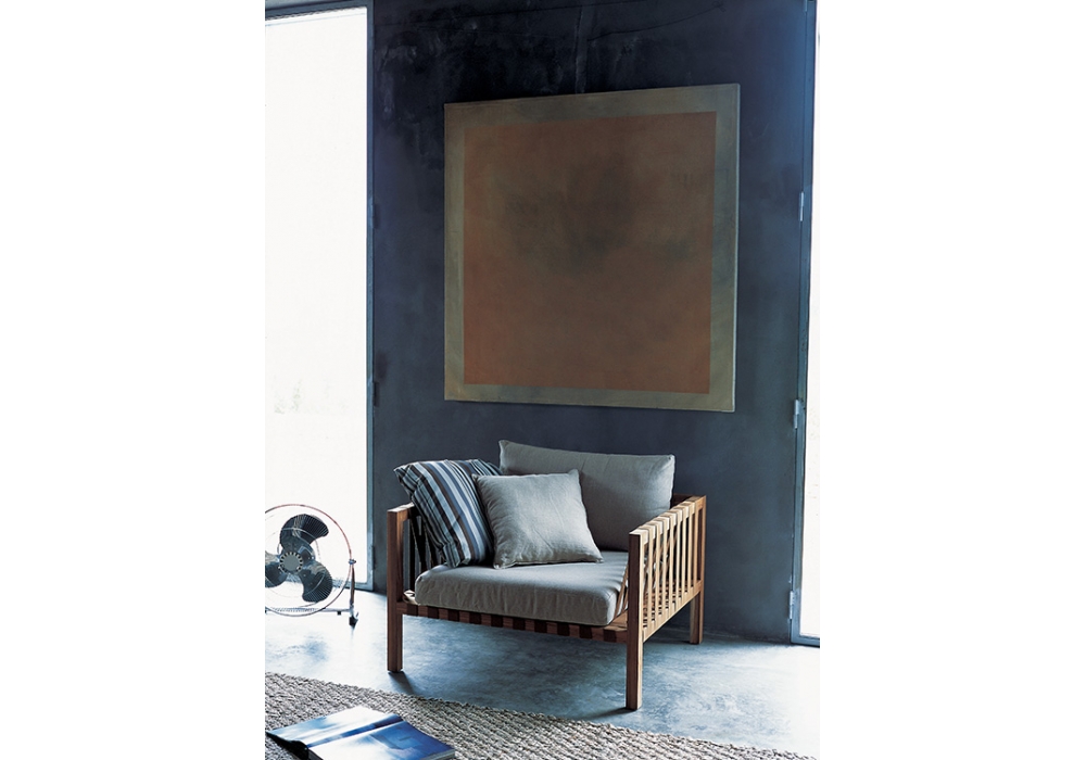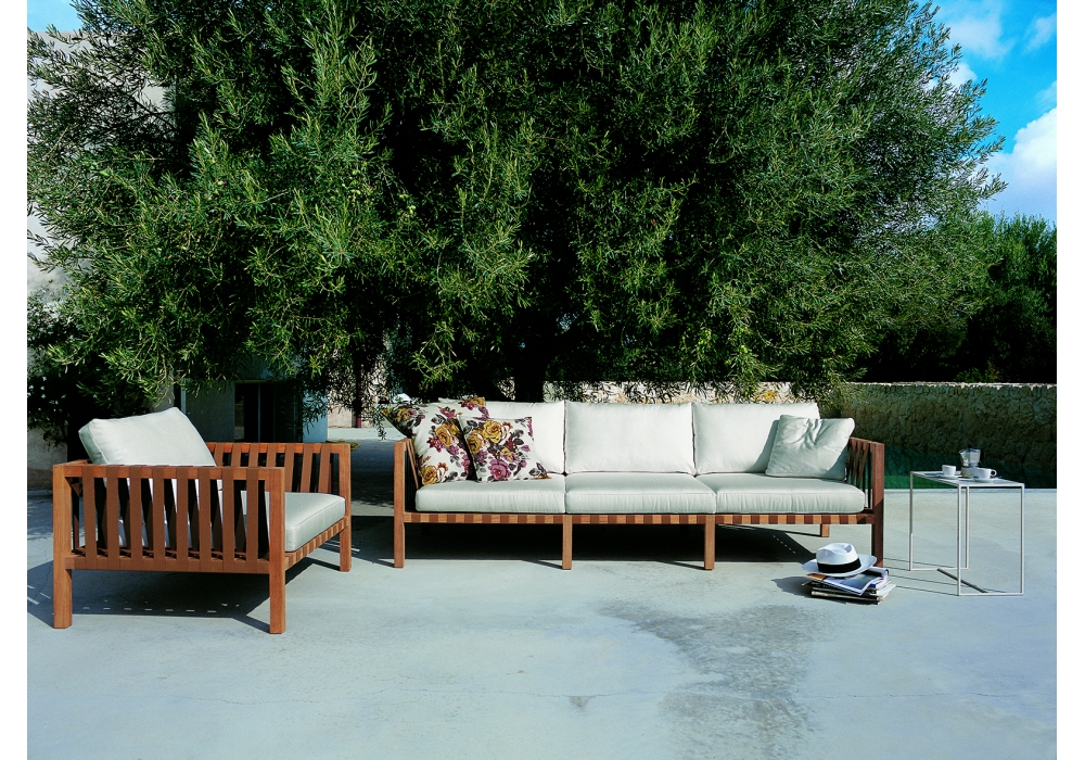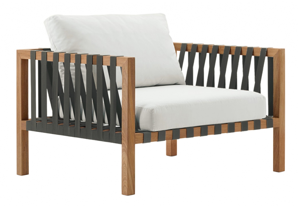 Mistral 101 firmata da Rodolfo Dordoni per Roda è una poltrona con struttura in teak e cuscini in tessuto. La struttura in massello di teak viene proposta con cinghie color grey, tabacco o verde oliva.