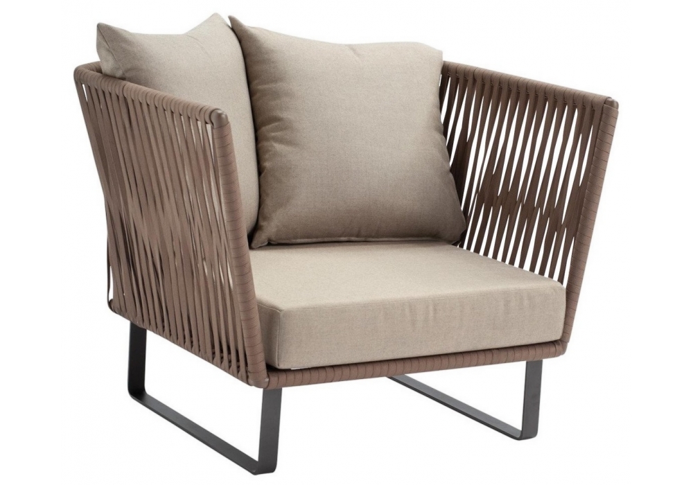 Bitta firmata da Rodolfo Dordoni per Kettal è una poltrona club caratterizzato dall'accostamento di base in alluminio, scocca con intreccio in corde di poliestere e confortevoli cuscini in materiale resistente alle intemperie.