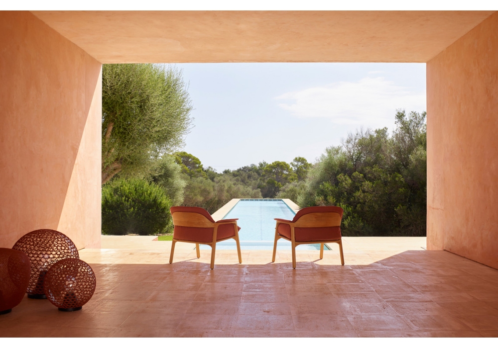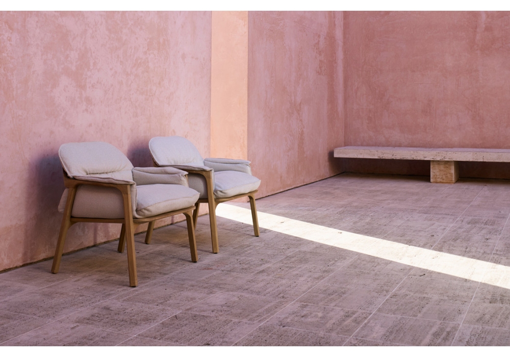 Nomad firmata da Monica Armani per Tribù è una poltrona con struttura realizzata in legno di teak e rivestimento in tessuto per esterni, disponibile in diverse finiture.