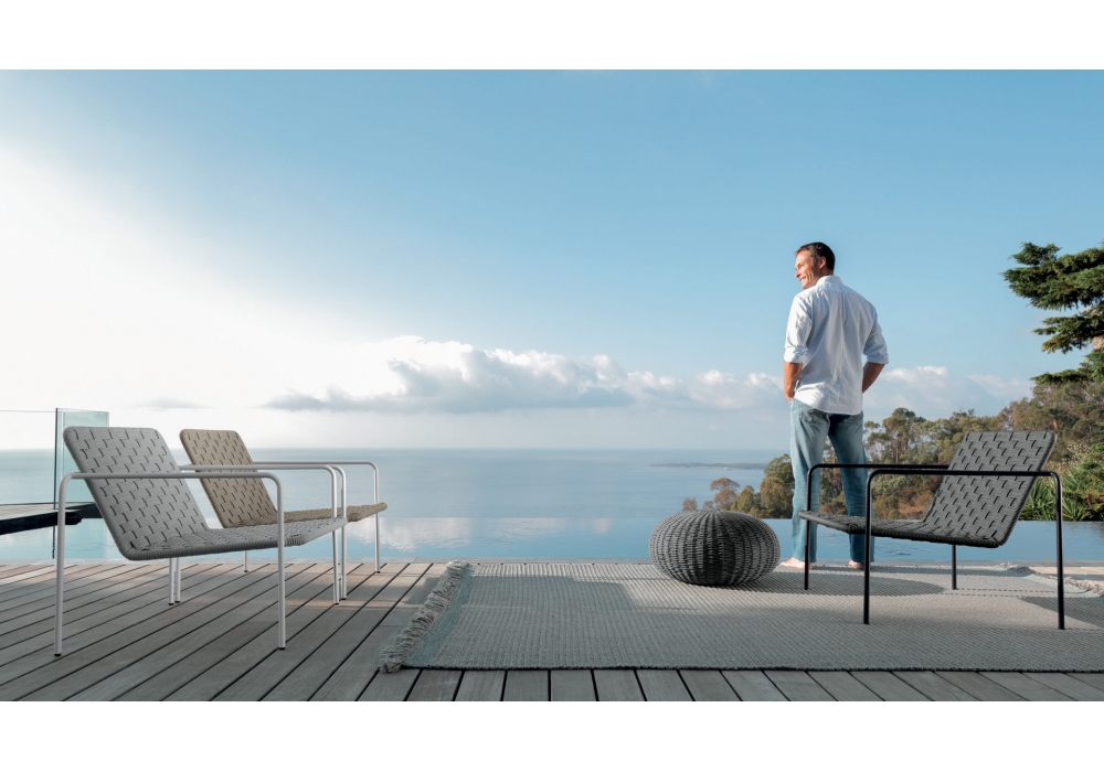 Jackie è una poltrona della collezione omonima disegnata per Talenti. Struttura in acciaio inox rivestita da corde intracciate a mano. Disponibile in quattro varianti colore: struttura bianca con schienali e seduta rivestiti in corda colore tortora (R15) o grigio chiaro (R16); struttura grafite con rivestimento in colore grigio scuro (R17)o verde militare (R18).