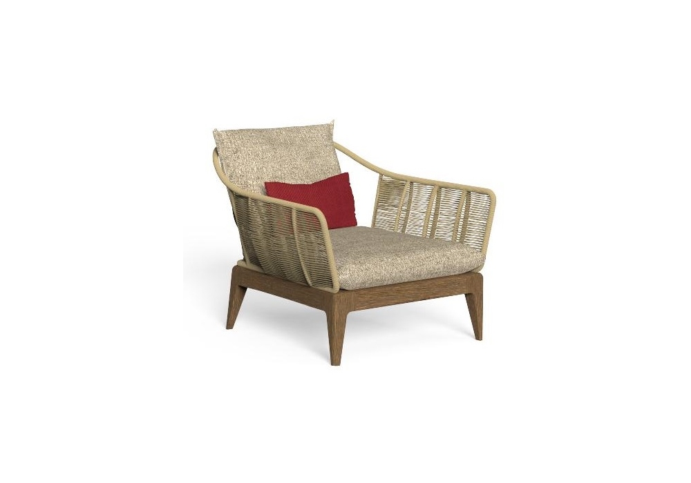 Cruise Teak disegnato da Ludovica e Roberto Palomba per Talenti è una poltrona con struttura in legno, schienale e braccioli in corda sintetica e cuscini con tessuto impermeabile.