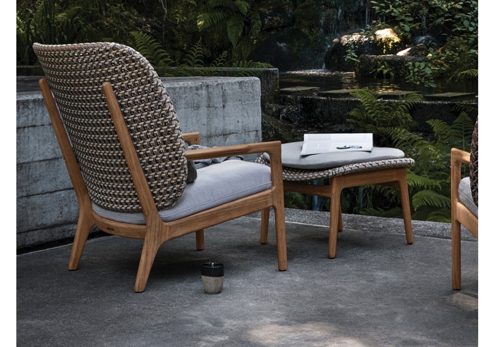 Kay firmata da Henrik Pedersen per Gloster è una poltrona lounge con struttura in teak e schienale in vimini intrecciato. Cuscino seduta in tessuto outdoor incluso. Disponibile in 2 dimensioni: con schienale basso o alto.