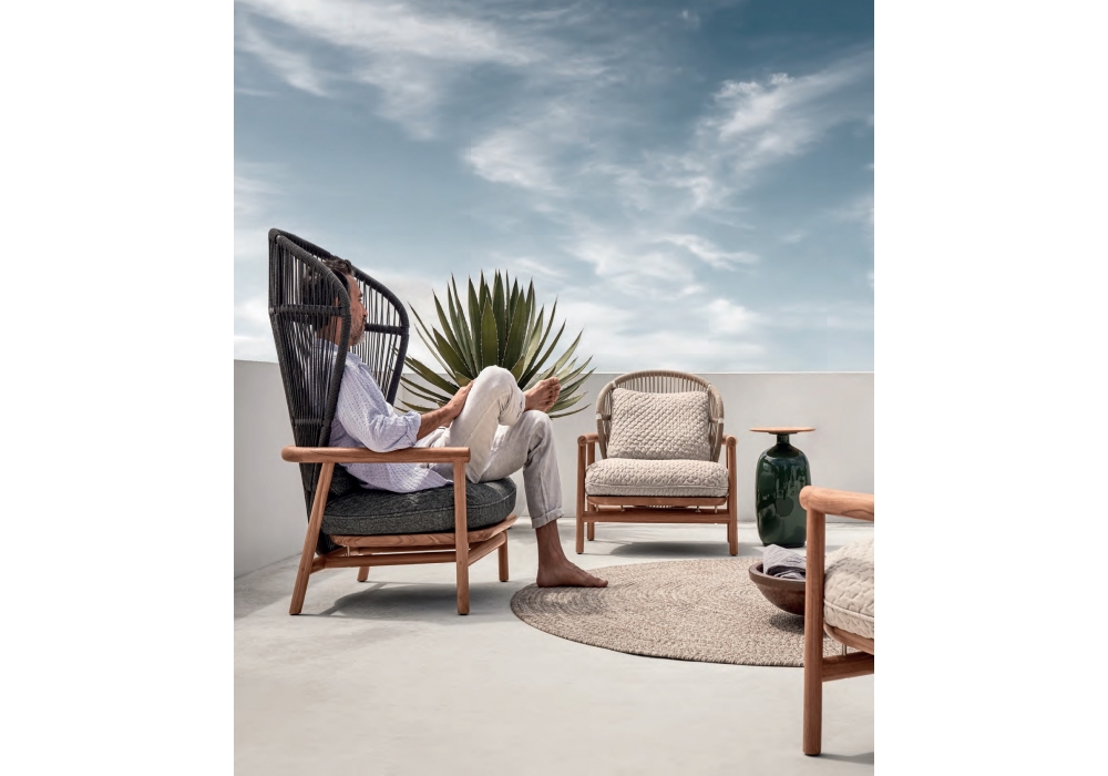 Fern firmata da Sebastian Herkner per Gloster è una poltrona lounge con struttura in teak e schienale in alluminio verniciato a polvere e corda intrecciata. Cuscini seduta / schienale in tessuto outdoor incluso. Disponibile in 2 dimensioni: con schienale basso o alto.