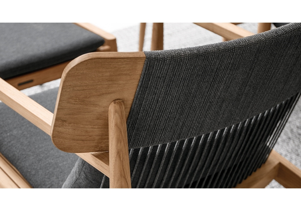 Archi firmata da Henrik Pedersen per Gloster è una poltrona lounge con struttura in teak e schienale avvolto in corda outdoor. Cuscini seduta / schienale in tessuto outdoor incluso.