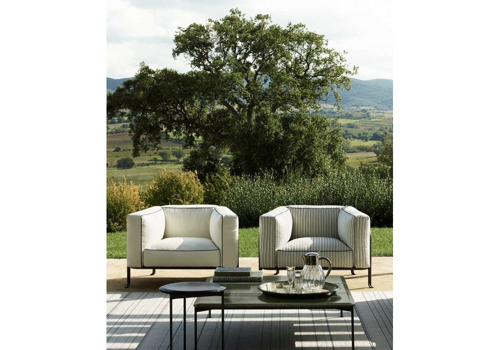 Borea firmata da Piero Lissoni per B&B Italia Outdoor è una poltrona con rivestimento in tessuto e struttura in tubolare e lamiera di alluminio. Imbottitura in poliuretano sagomato a densità differenziata, fibra poliestere.