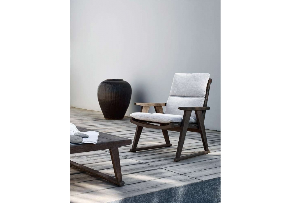 Gio firmata da Antonio Citterio per B&B Italia Outdoor è una poltrona con struttura in massello di teak nella speciale finitura antique grey, imbottitura in poliuretano sagomato a densità differenziata e rivestimento in tessuto.