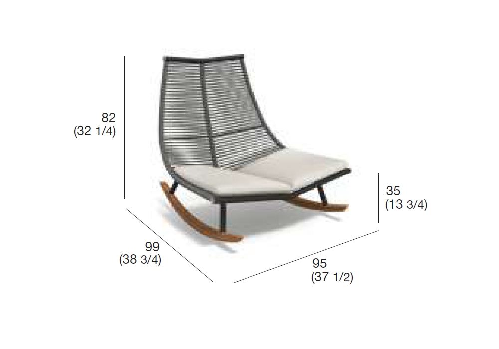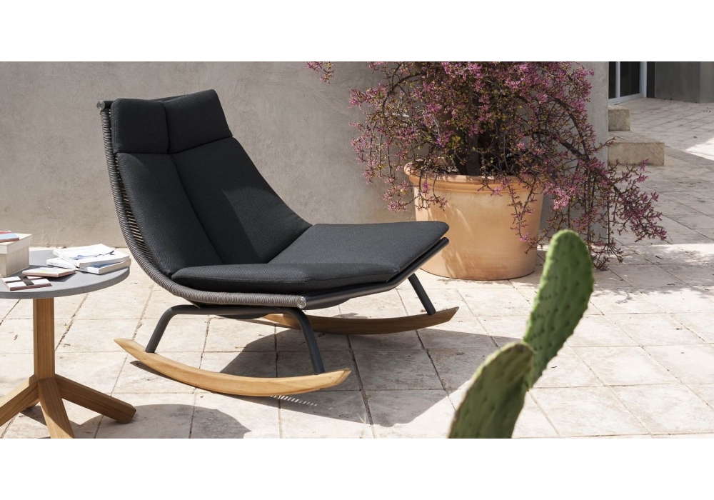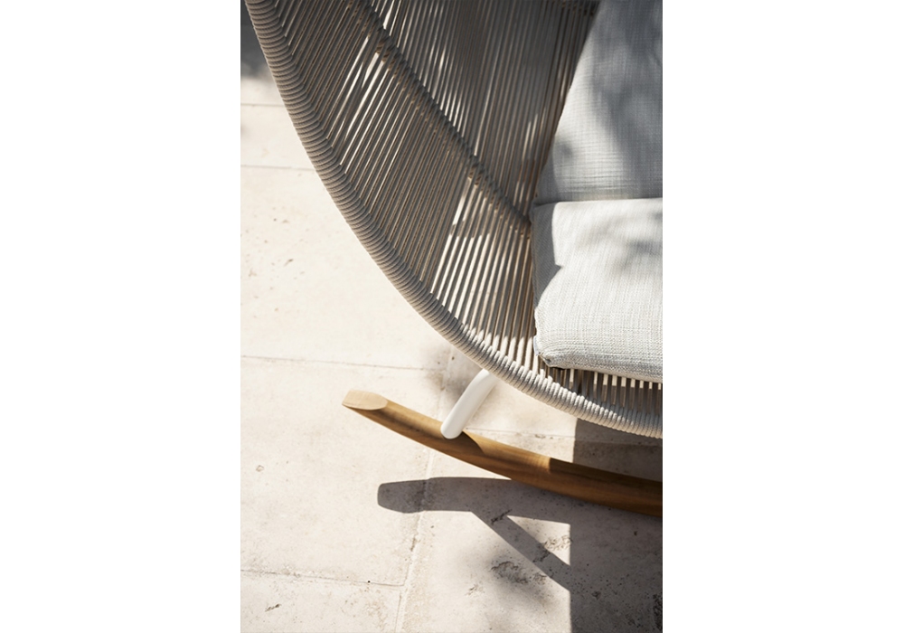 Laze firmata da Gordon Guillaumier per Roda è una sedia a dondolo da esterno con struttura in acciaio inossidabile verniciato a polvere, pattini in teak e scocca composta da corde di poliestere o acrilico.