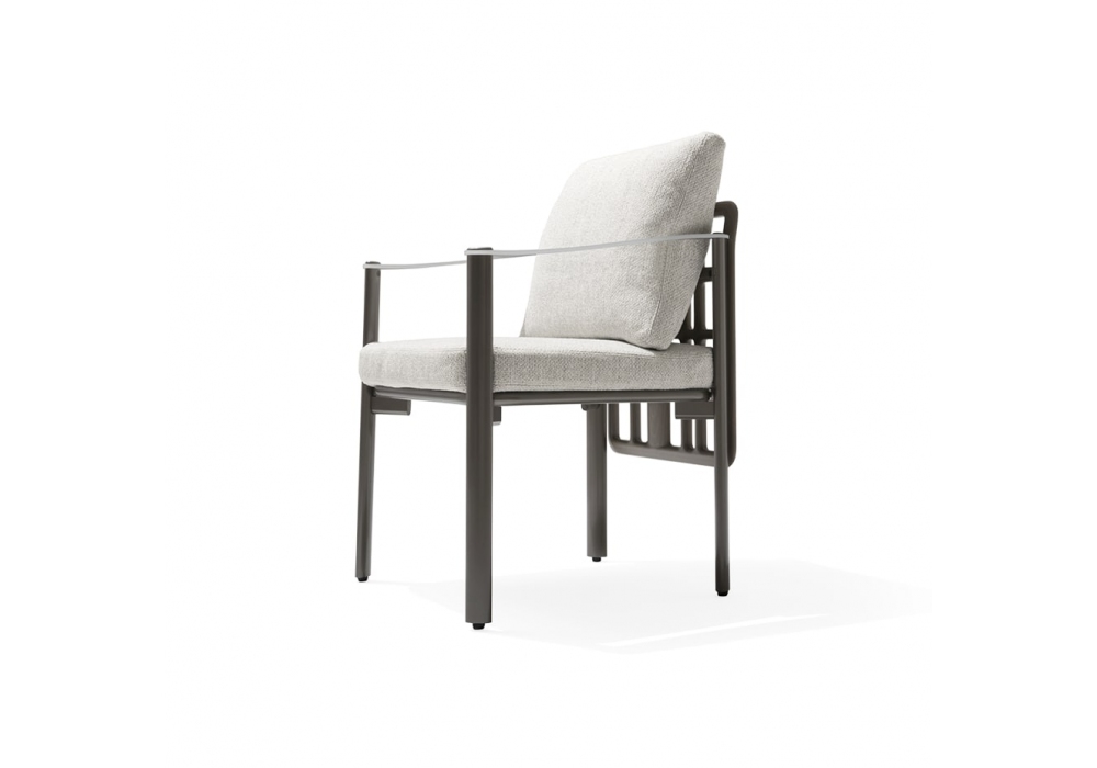 Aldìa firmata da Carlo Colombo per Giorgetti è una poltroncina da esterno con schienale in multistrato di betulla ricomposto disponibile in due finiture. La poltroncina è dotata di braccioli in gomma EVA, disponibile in diversi colori. La base è in metallo verniciato finitura Pewter. Il rivestimento di cuscini e seduta è disponibile in diversi tessuti e colori.