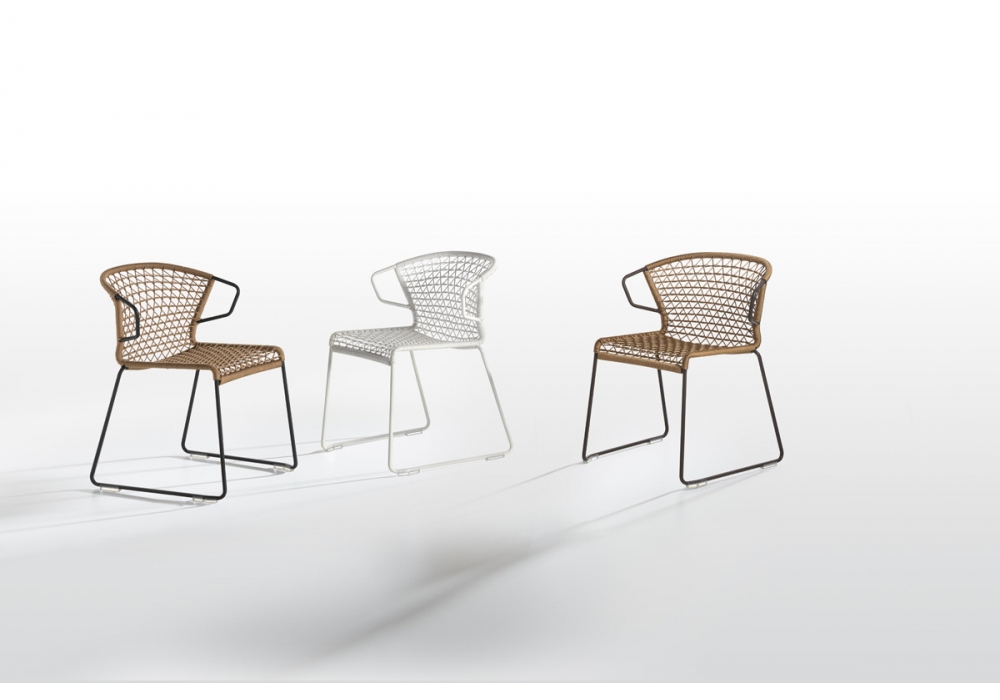 Vela firmata da Hannes Wettstein per Potocco è una poltrona outdoor strutturata interamente in metallo verniciato in differenti finiture. Seduta e schienale sono rivestiti con un intreccio in corda di canapa o PVC in diverse colorazioni.