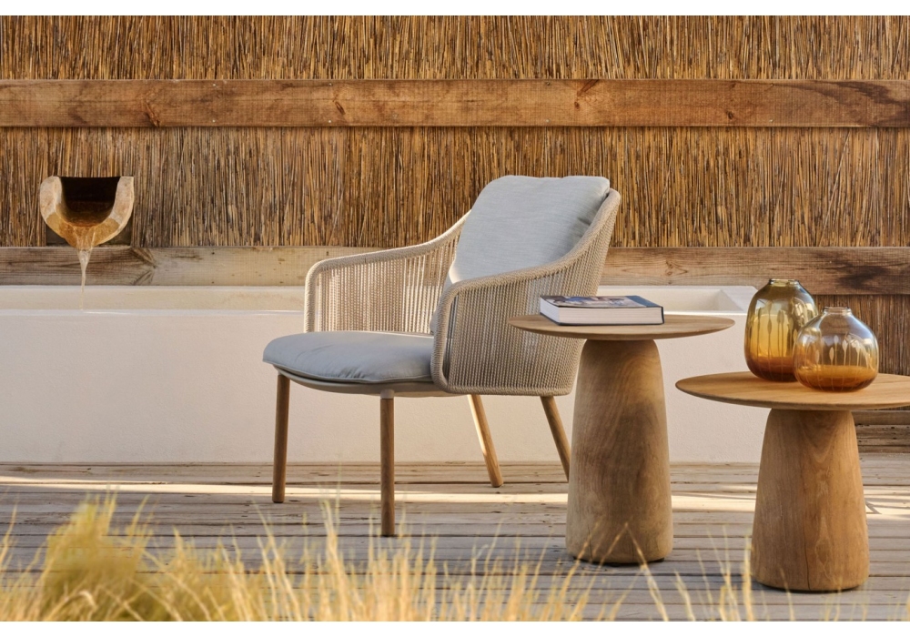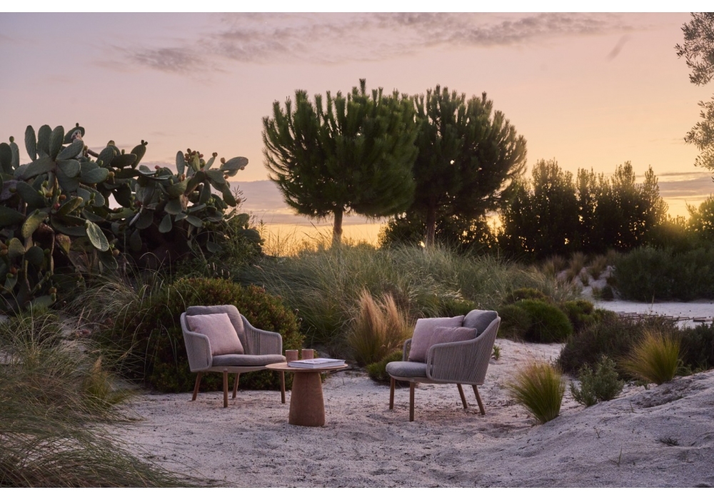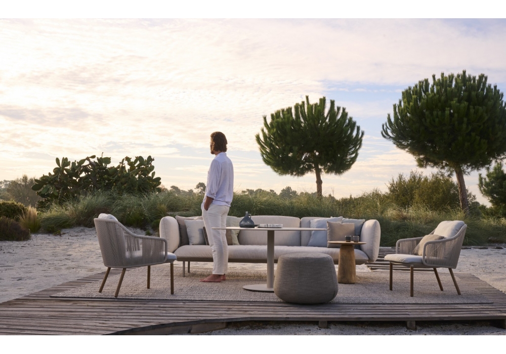 Senja firmata da Studio Segers per Tribù è una poltrona con schienale in Canax color lino, le gambe in alluminio verniciato a polvere o in teak, e la scocca della seduta in alluminio verniciato. Rivestimento dei cuscini di seduta e schienale disponibile in diversi colori.