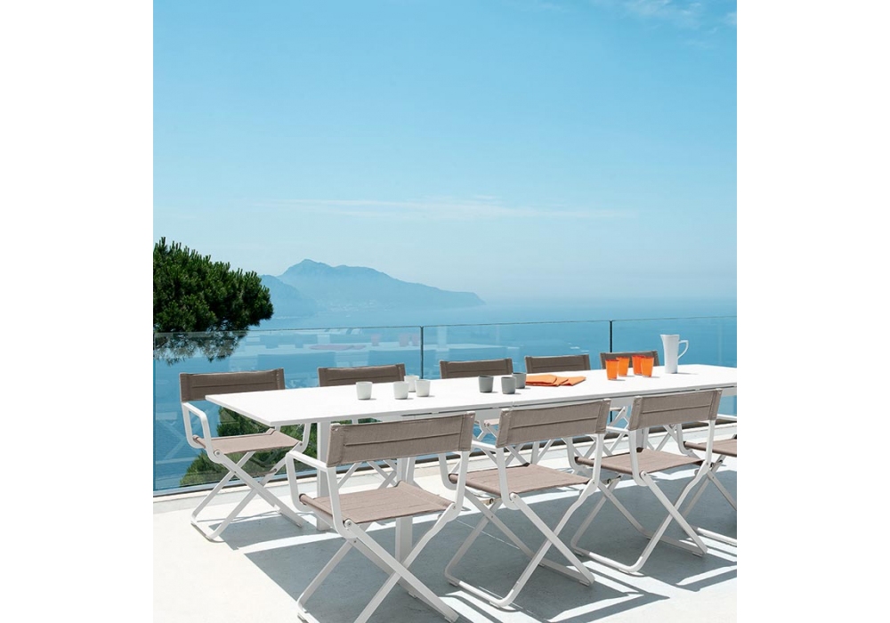 Studios prodotta e firmata da Ethimo è una poltroncina pieghevole con struttura portante in alluminio verniciato e rivestita in tessuto acrilico. Studios è disponibile in differenti finiture