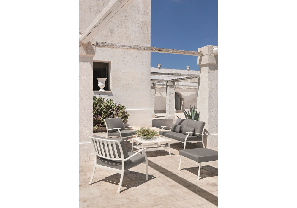 Elisir prodotta e firmata da Ethimo è una poltrona con struttura portante in metallo verniciato. La cuscinatura è rivestita in tessuto acrilico idrorepellente. Elisir è disponibile in differenti finiture.
