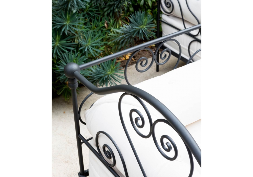 Aurora prodotta e firmata da Unopiù è una poltrona con struttura in ferro forgiato a mano e verniciato color grafite. La cuscinatura di seduta e schienale è realizzata in tessuto acrilico color latte.