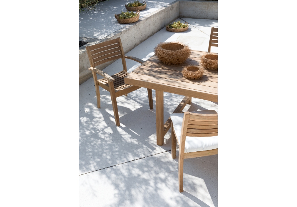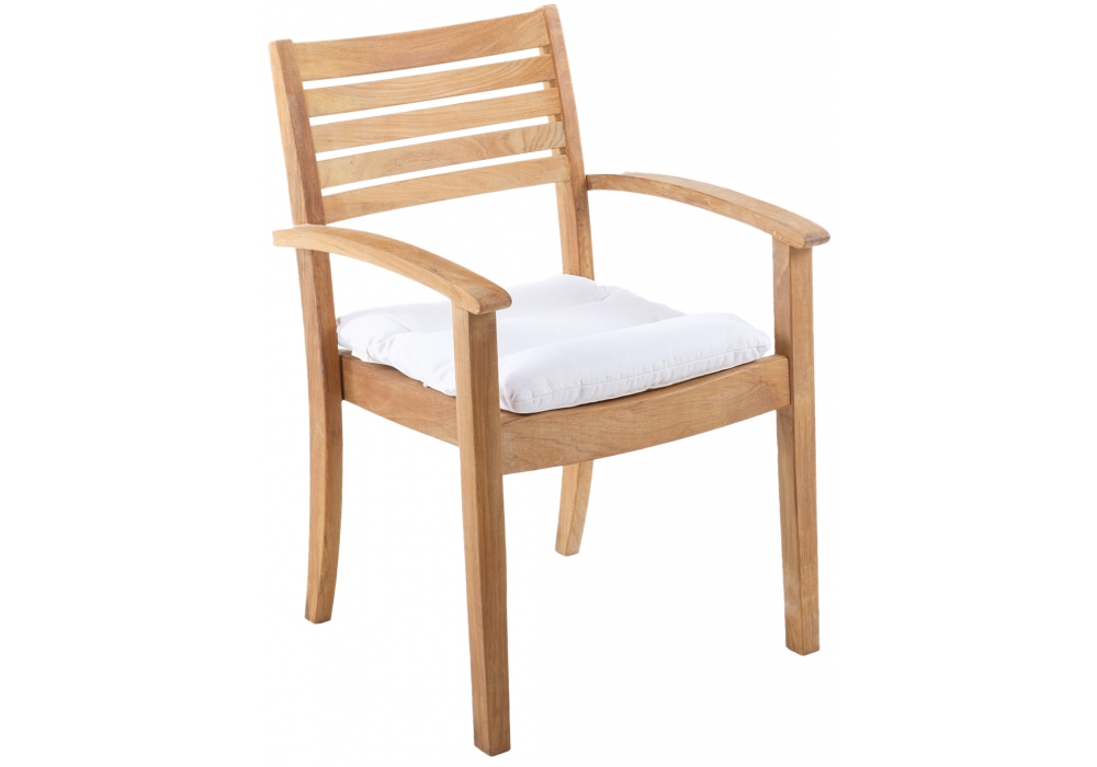 Chelsea prodotta e firmata da Unopiù è una poltroncina impilabile con struttura in legno teak naturale e cuscinatura in tessuto acrilico color latte.