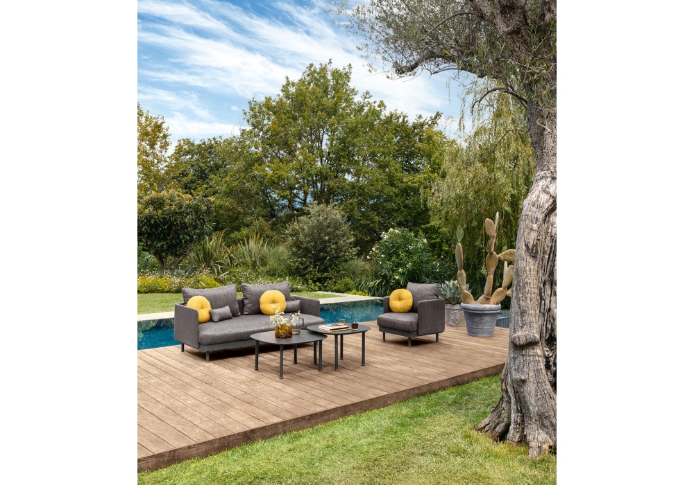 Slam firmata da Ludovica + Roberto Palomba per Talenti è una poltrona da esterno con struttura in alluminio verniciato a polvere. Schienale e cuscini sono sfoderabili e sono rivestiti con tessuti per esterni resistenti agli agenti atmosferici.