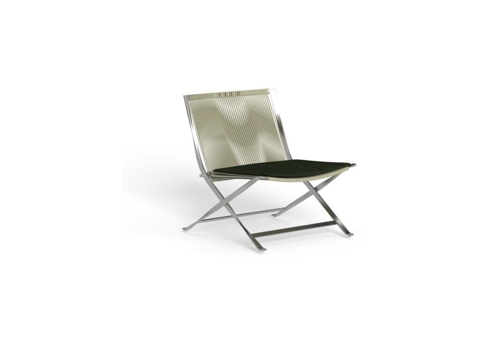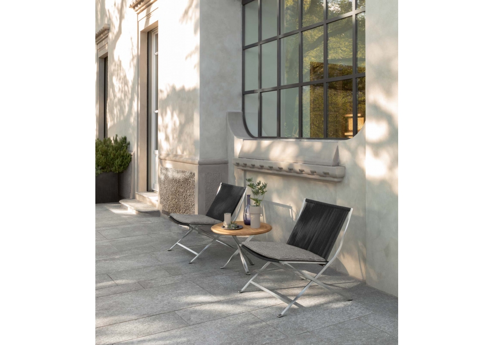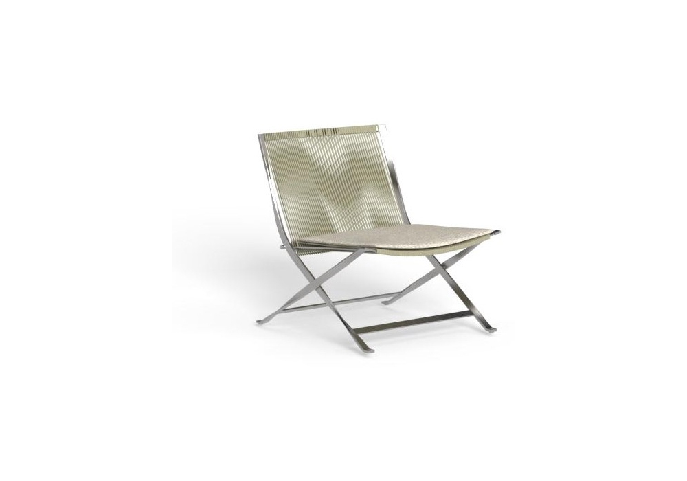 George firmata da Ludovica + Roberto Palomba per Talenti è una poltrona pieghevole per esterno con struttura in acciaio inox. Il sedile e lo schienale sono rivestiti da un intreccio di corde sintetiche.