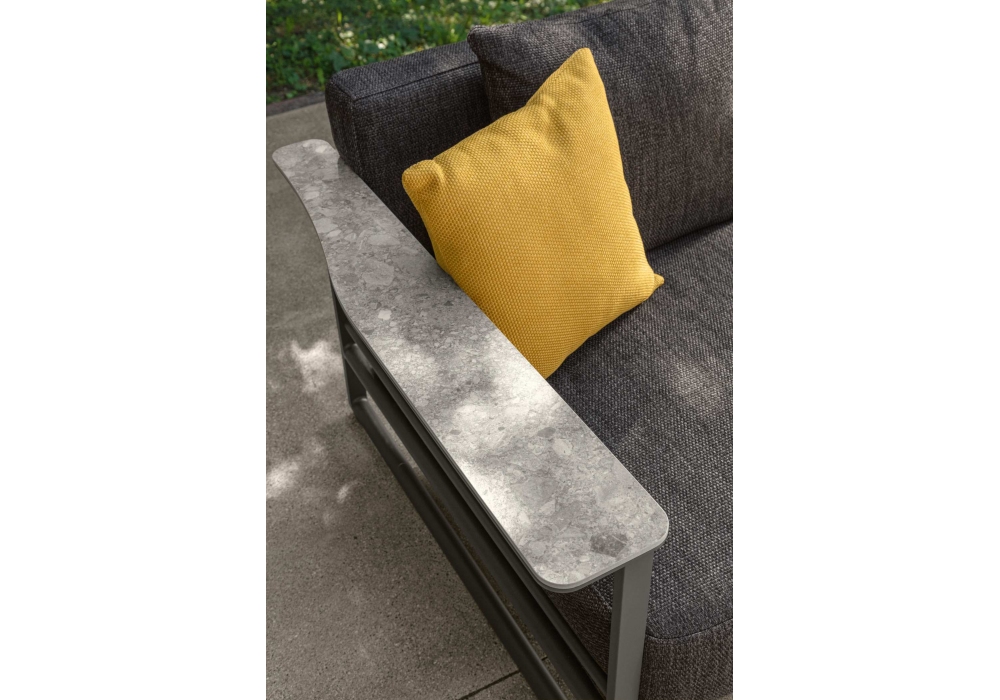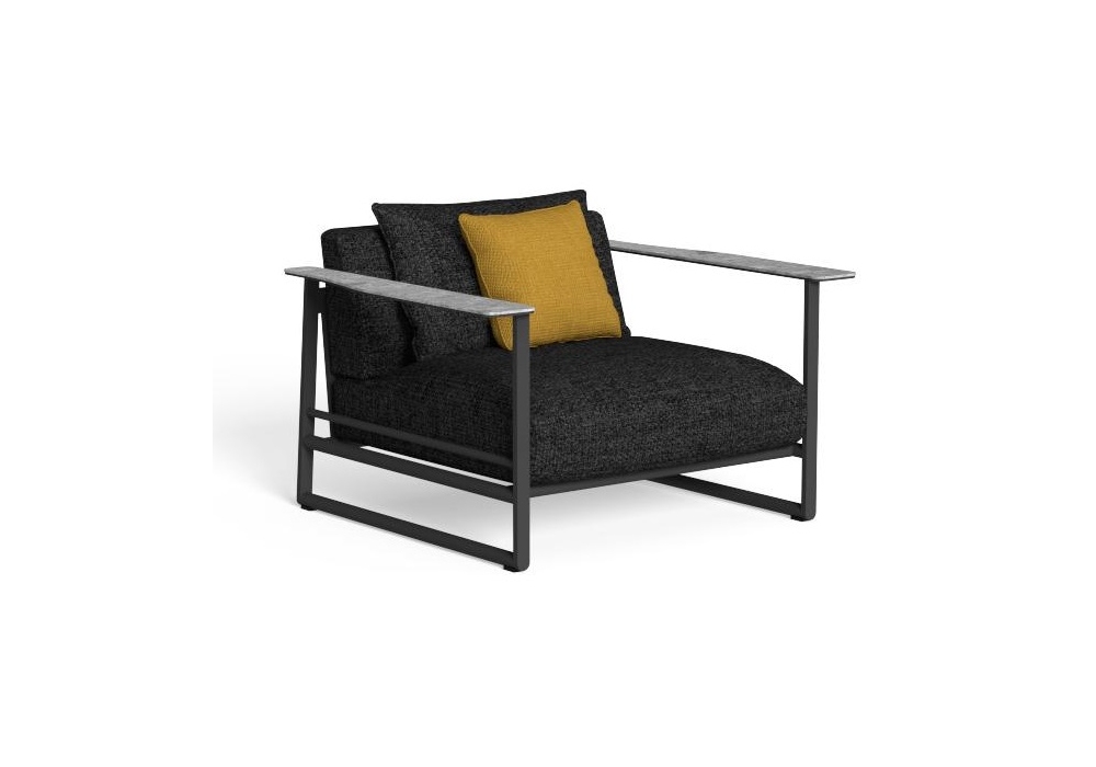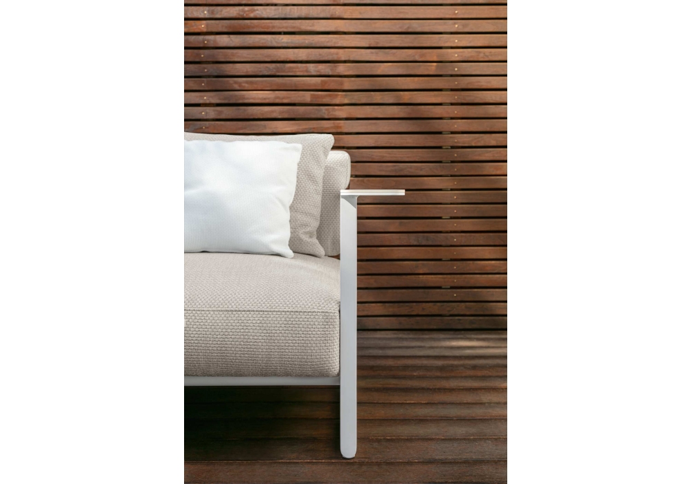 Riviera firmata da Jean Philippe Nuel per Talenti è una poltrona da esterno con struttura in alluminio verniciato a polveri, braccioli con inserto in gres. I cuscini sono sfoderabili e sono rivestiti con tessuti per esterni resistenti agli agenti atmosferici.