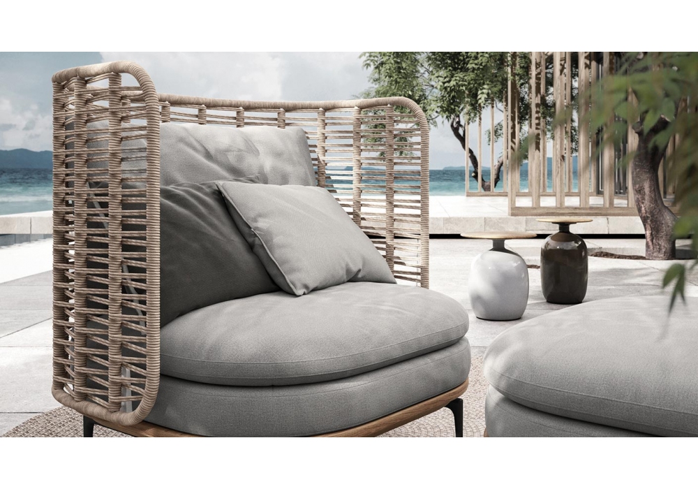 Mistral firmata da Henrik Pedersen per Gloster è una poltrona lounge per esterni composta da struttura in alluminio verniciato a polvere e teak naturale. Pannelli posteriori in vimini intrecciati.