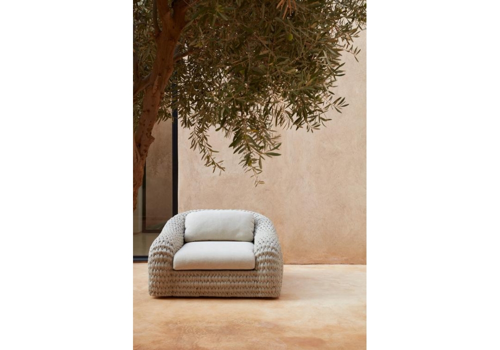 Kobo firmata da Stephane De Winter per Manutti è una poltrona per esterni con struttura in corda intessuta a mano attorno a un telaio in alluminio saldato. Disponibile in differenti finiture.