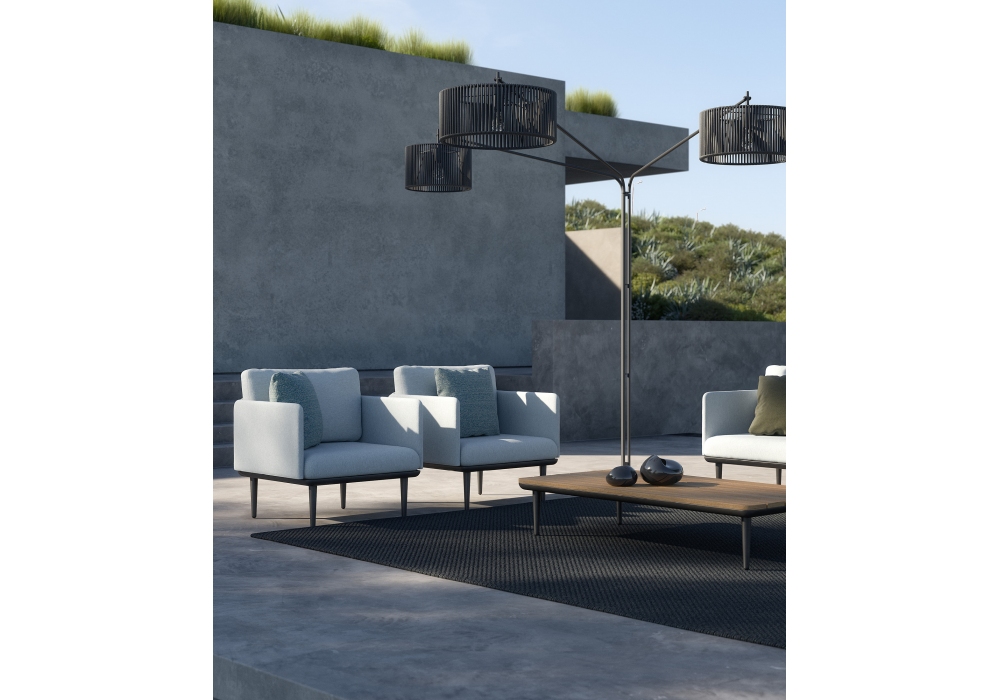 Styletto Lounge firmata da Kris Van Puyvelde per Royal Botania è una poltrona da esterno con struttura in alluminio e cuscinatura con rivestimento in differenti finiture.