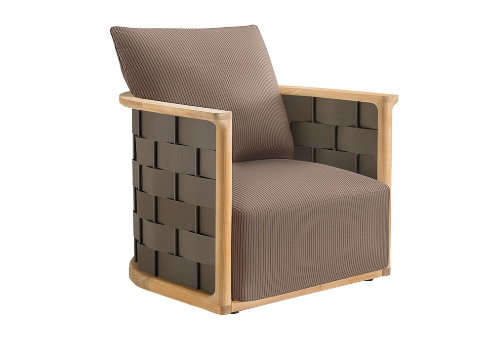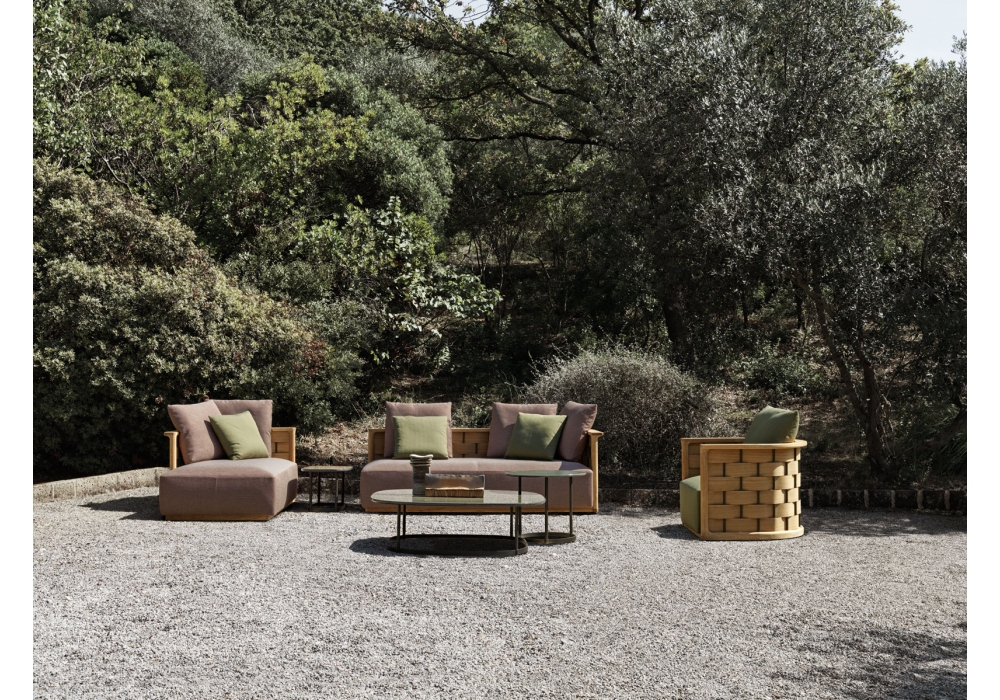 Palinfrasca firmata da Vincent Van Duysen per Molteni&C è una poltrona realizzata con struttura in massello di teak, scocca con intreccio a fasce in teak oppure in poliuretano EVA verde oliva. Imbottitura in poliuretano e rivestimento in tessuto. Cuscino schienale opzionale.