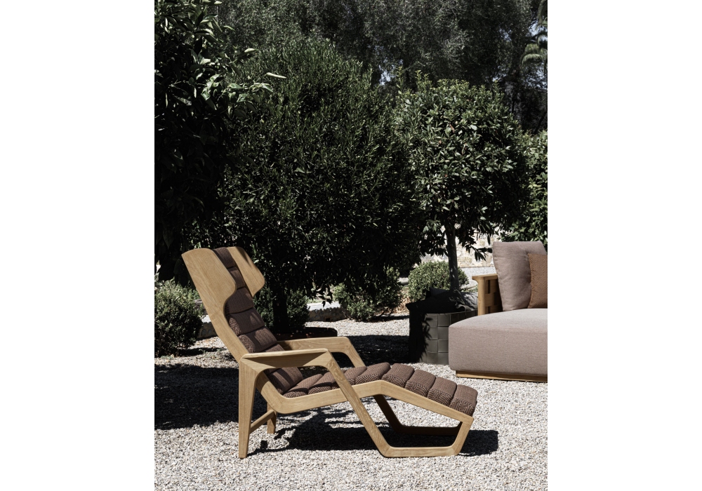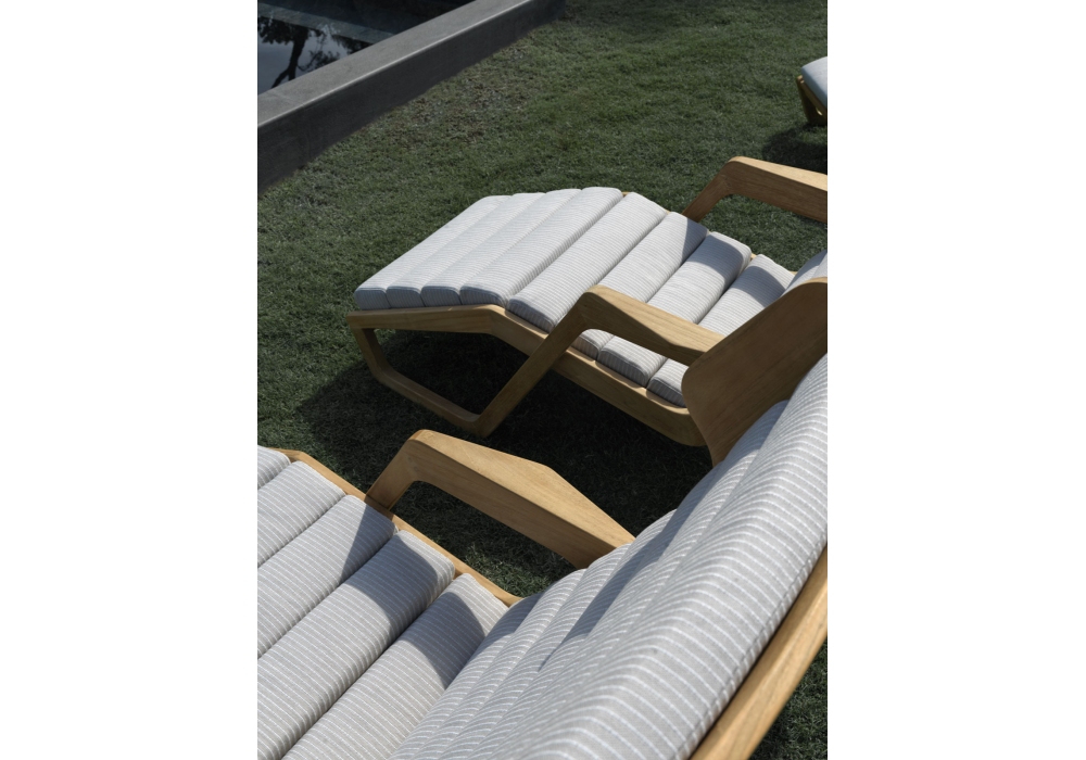 D.150.5 firmata da Gio Ponti per Molteni&C è una chaise longue realizzata con struttura in legno massello di teak in finitura naturale, puntali d’appoggio in materiale plastico e rivestimento in tessuto.