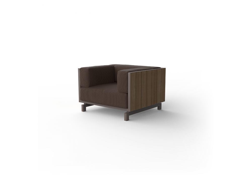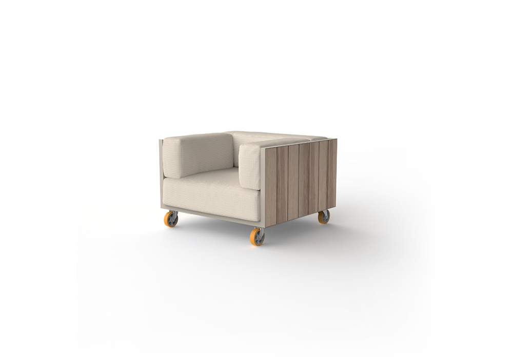 Vineyard firmata da Ramón Esteve per Vondom è una poltrona realizzata con struttura in alluminio, pannelli in legno e cuscini imbottiti con rivestimento in tessuto. Disponibile con ruote o con gambe.